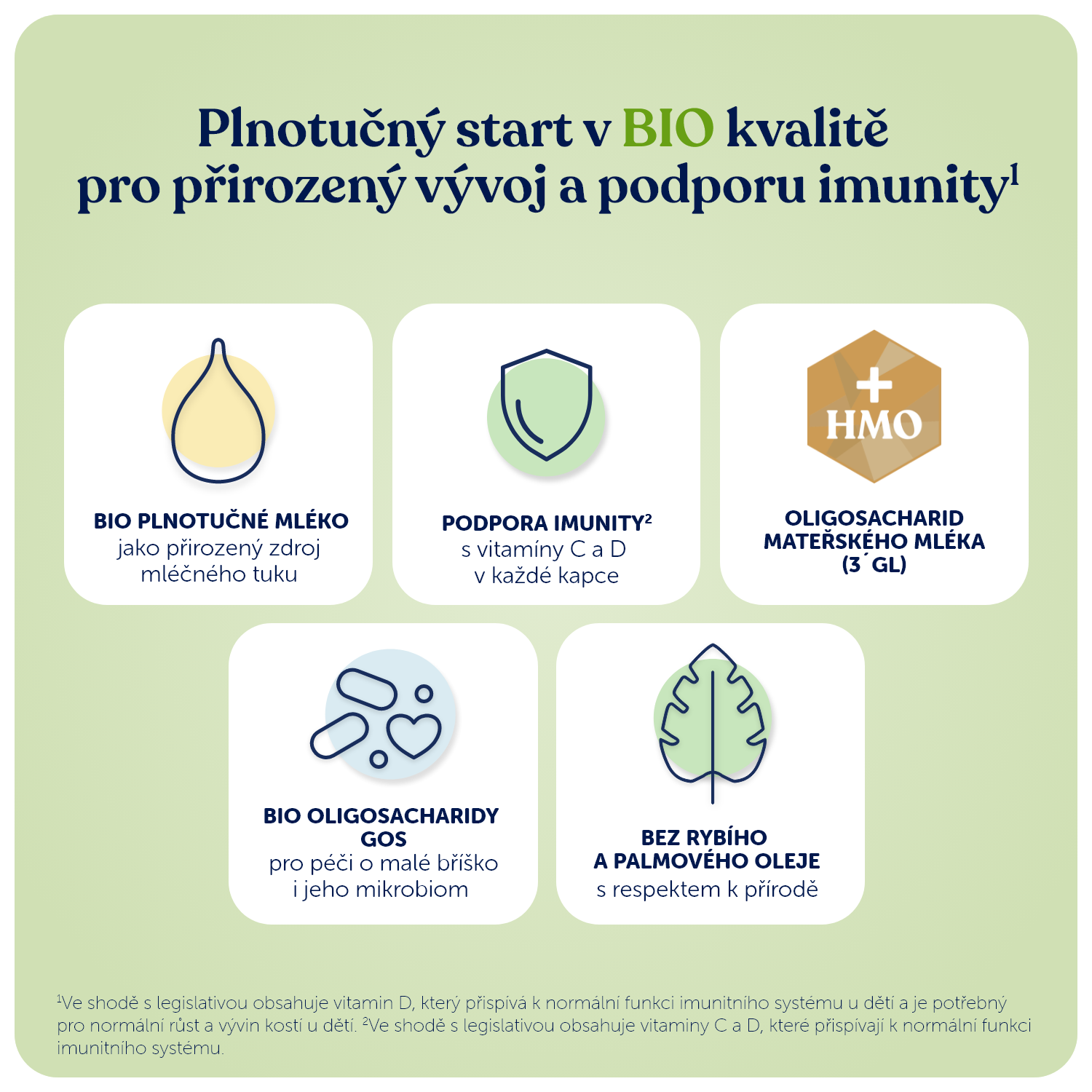 BIO plnotučné MLÉKO (103,5 g tekutého mléka na 100 g prášku), BIO odstředěné MLÉKO, BIO demineralizovaná bílkovina MLÉČNÉ syrovátky, BIO rostlinné oleje (slunečnicový, kokosový, řepkový), BIO galaktooligosacharidy (z MLÉKA) 2,6 %, citrát vápenatý, citronan sodný, chlorid draselný, mléčnan vápenatý, chlorid hořečnatý, olej z mikrořas Schizochytrium sp., vitamín C, hydroxid draselný, cholin bitartát, inositol, olej z Mortierella alpina, taurin, nukleotidy (cytidin-5‘-monofosfát, sodná sůl uridin-5‘-monofosfátu, adenosin-5‘-monofosfát, sodná sůl inosin-5-monofosfátu, sodná sůl guanosin-5‘-monofosfátu), síran železnatý, síran zinečnatý, vitamín E, niacin, kyselina pantothenová, síran měďnatý, thiamin, riboflavin, vitamín A, vitamín B6, síran manganatý, kyselina listová, jodid draselný, seleničitan sodný, vitamín K, vitamín D3, biotin, vitamín B12.