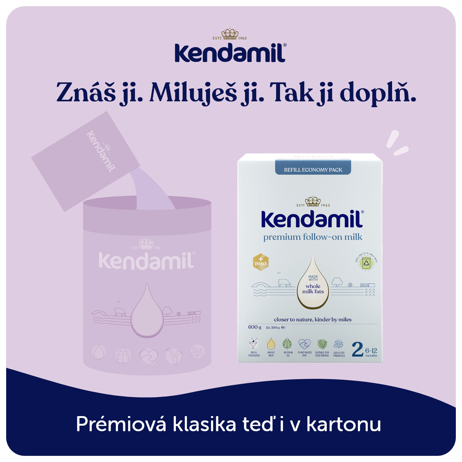 Pokračovací mléčná kojenecká výživa v prášku. Potravina je určená pro výživu kojenců od ukončeného 6. do 12. měsíce. Nová vylepšená receptura s oligosacharidem mateřského mléka HMO (3´GL) a prebiotiky (GOS a FOS) vznikla na základě 60letého výzkumu a vývoje. Kojenecké mléko Kendamil Premium je inspirováno tím nejlepším z přírody. Jeho základ tvoří především plnotučné kravské mléko s přirozeným obsahem mléčného tuku po vzoru mateřského mléka.