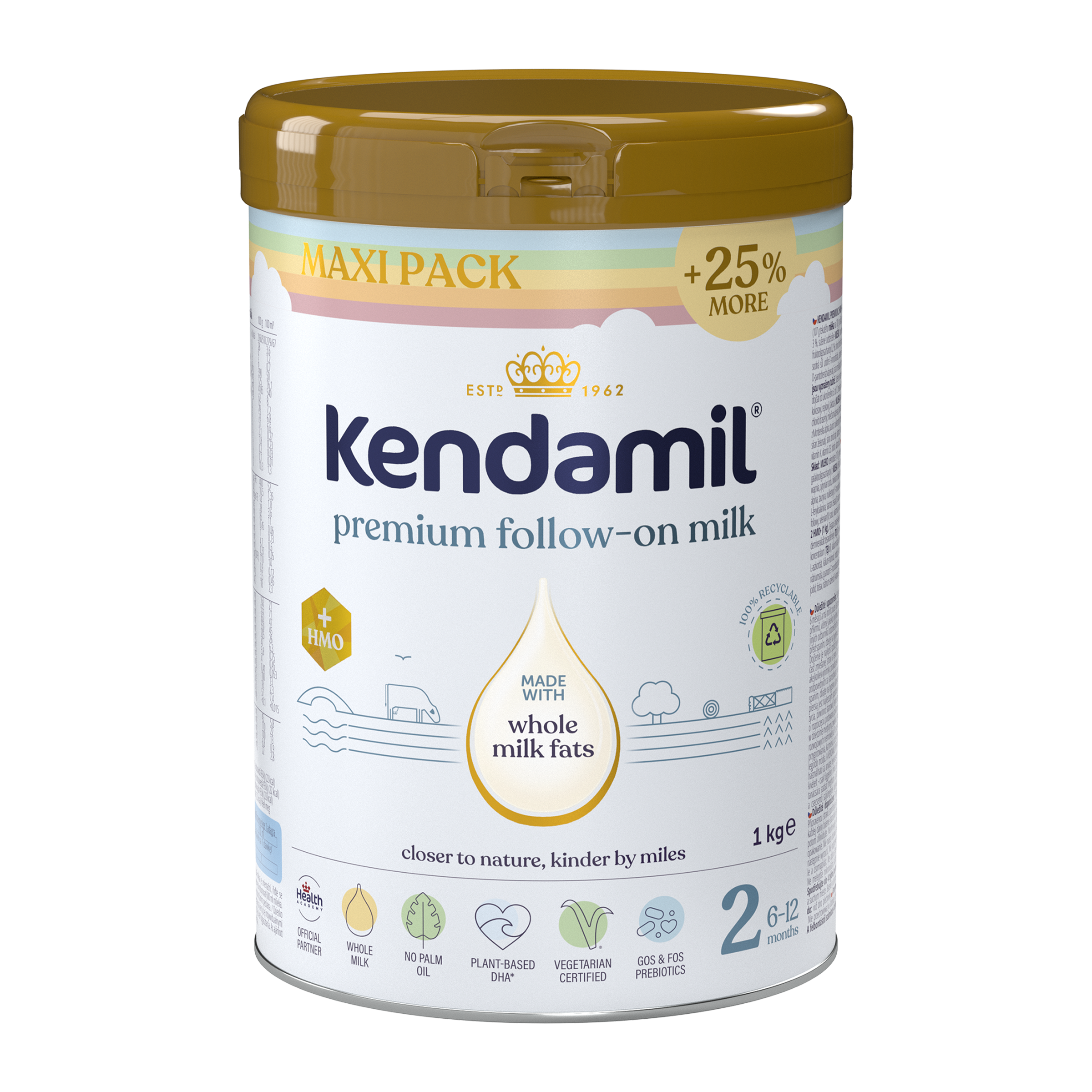 Pokračovací mléčná kojenecká výživa v prášku. Potravina je určená pro výživu kojenců od ukončeného 6. do 12. měsíce. Nová vylepšená receptura s oligosacharidem mateřského mléka HMO (3´GL) a prebiotiky (GOS a FOS) vznikla na základě 60letého výzkumu a vývoje. Kojenecké mléko Kendamil Premium je inspirováno tím nejlepším z přírody. Jeho základ tvoří především plnotučné kravské mléko s přirozeným obsahem mléčného tuku po vzoru mateřského mléka. Určeno pro miminka od ukončeného 6. měsíce do jednoho roku. Obal je plně recyklovatelný.