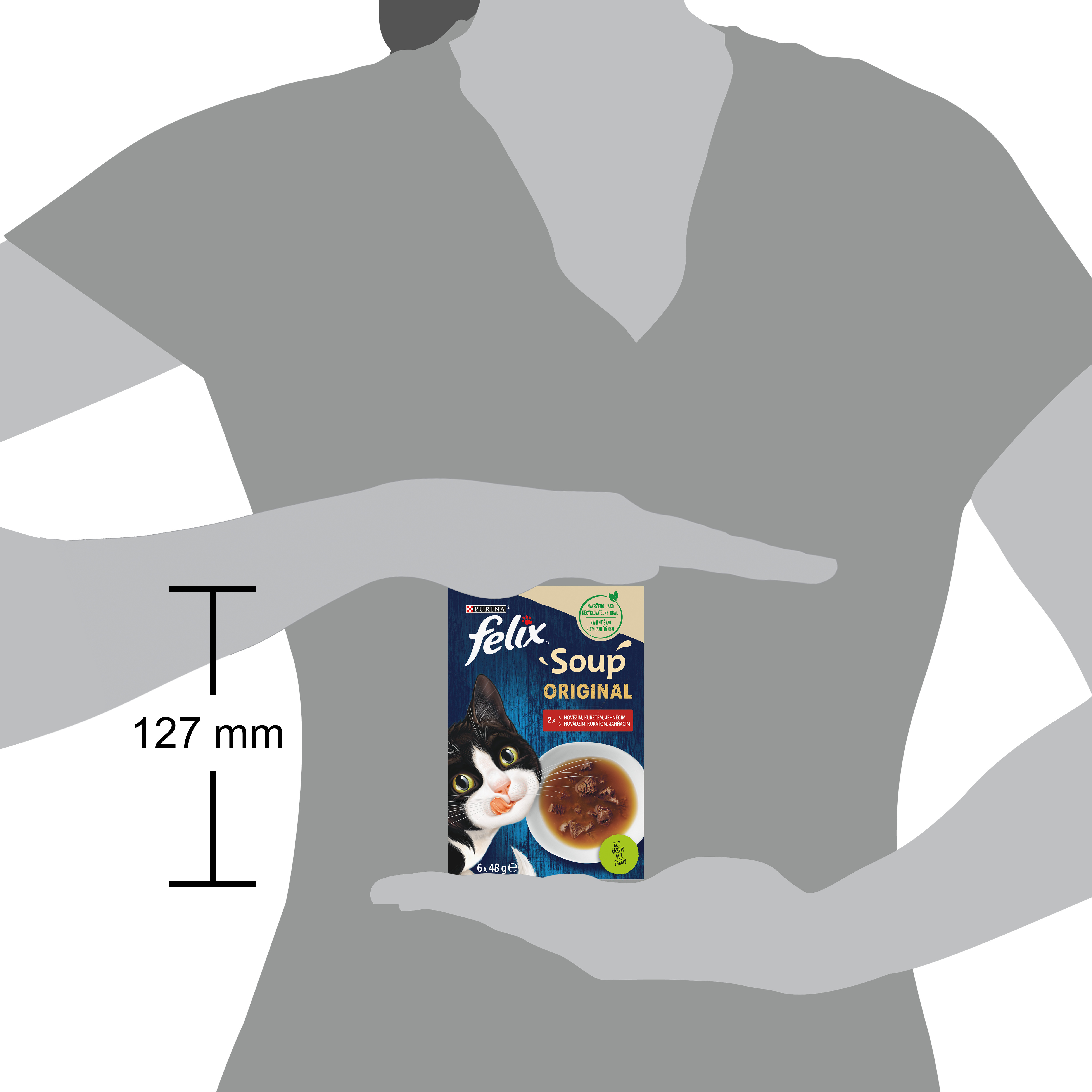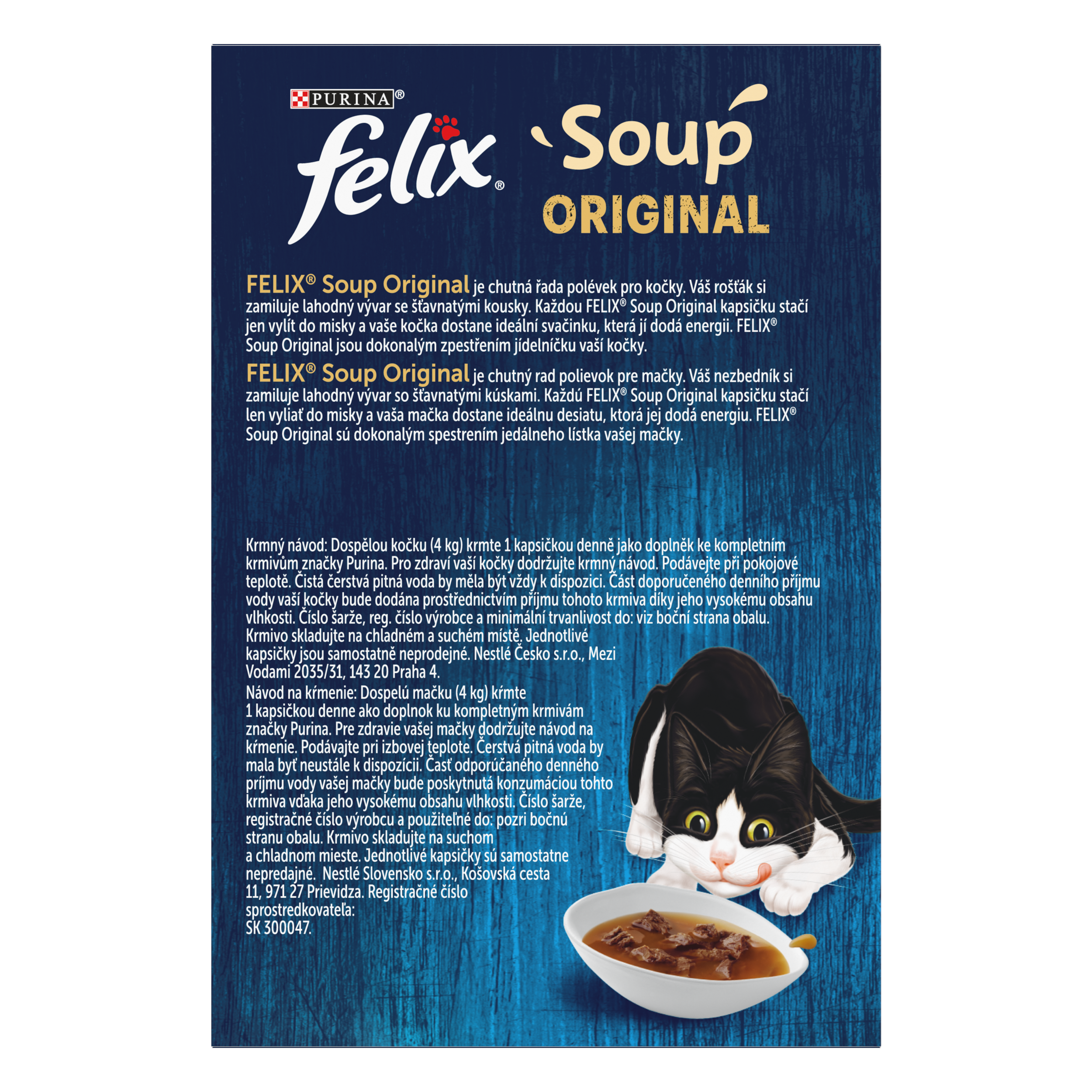 FELIX Soup Original je chutná řada polévek pro kočky. Váš rošťák si zamiluje lahodný vývar se šťavnatými kousky. Každou FELIX Soup Original kapsičku stačí jen vylít do misky a vaše kočka dostane ideální svačinku, která jí dodá energii. FELIX Soup Original jsou dokonalým zpestřením jídelníčku vaší kočky. FELIX Soup Original jsou dostupné v různých příchutích. Vyzkoušejte FELIX Soup Original s treskou, platýsem, tuňákem nebo FELIX Soup Original s hovězím, kuřetem, jehněčím.