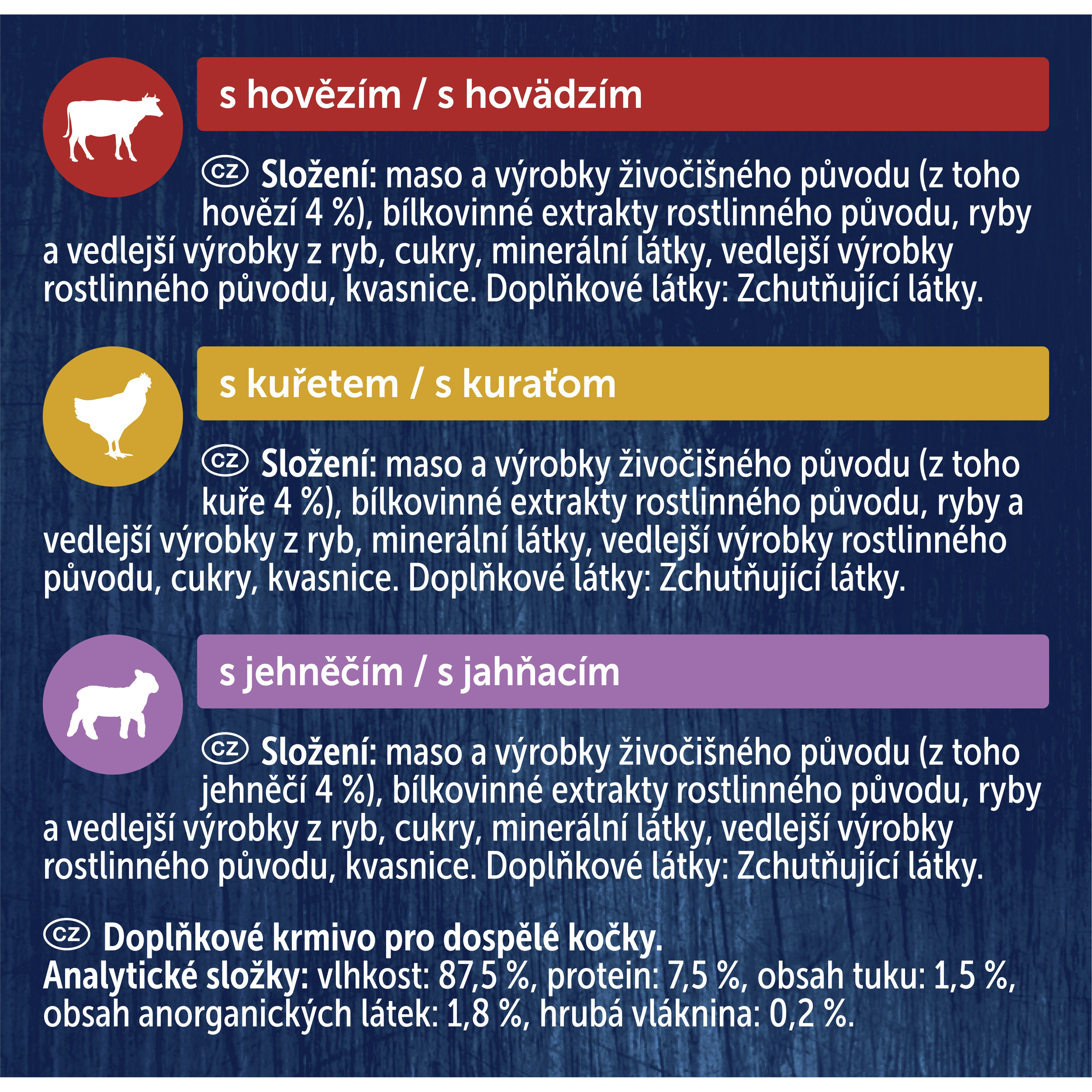 S kuřetem: maso a výrobky živočišného původu (z toho kuře 4 %), bílkovinné extrakty rostlinného původu, ryby a vedlejší výrobky z ryb, minerální látky, vedlejší výrobky rostlinného původu, cukry, kvasnice