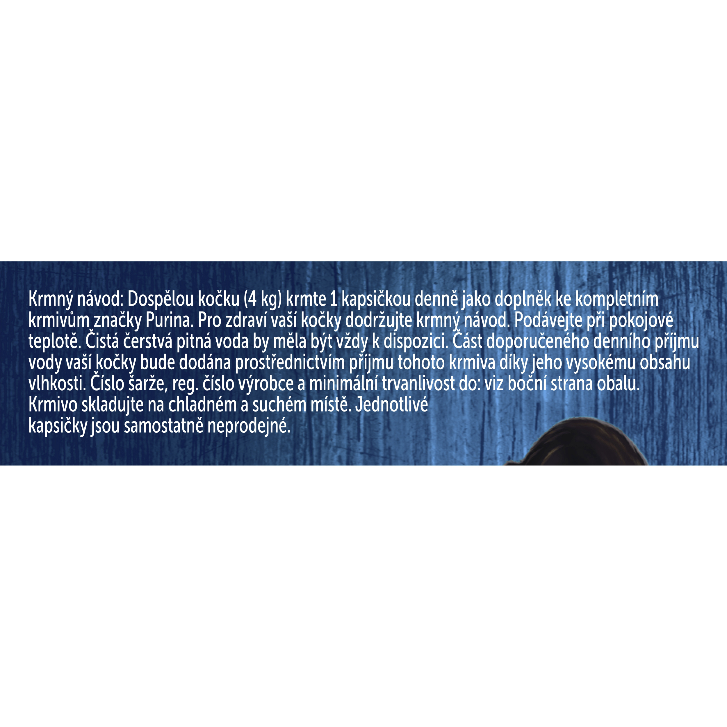 Krmný návod: Dospělou kočku (4 kg) krmte 1 kapsičkou denně jako doplněk ke kompletním krmivům značky Purina. Pro zdraví vaší kočky dodržujte krmný návod. Podávejte při pokojové teplotě. Čistá čerstvá pitná voda by měla být vždy k dispozici. Část doporučeného denního příjmu vody vaší kočky bude dodána prostřednictvím příjmu tohoto krmiva díky jeho vysokému obsahu vlhkosti.