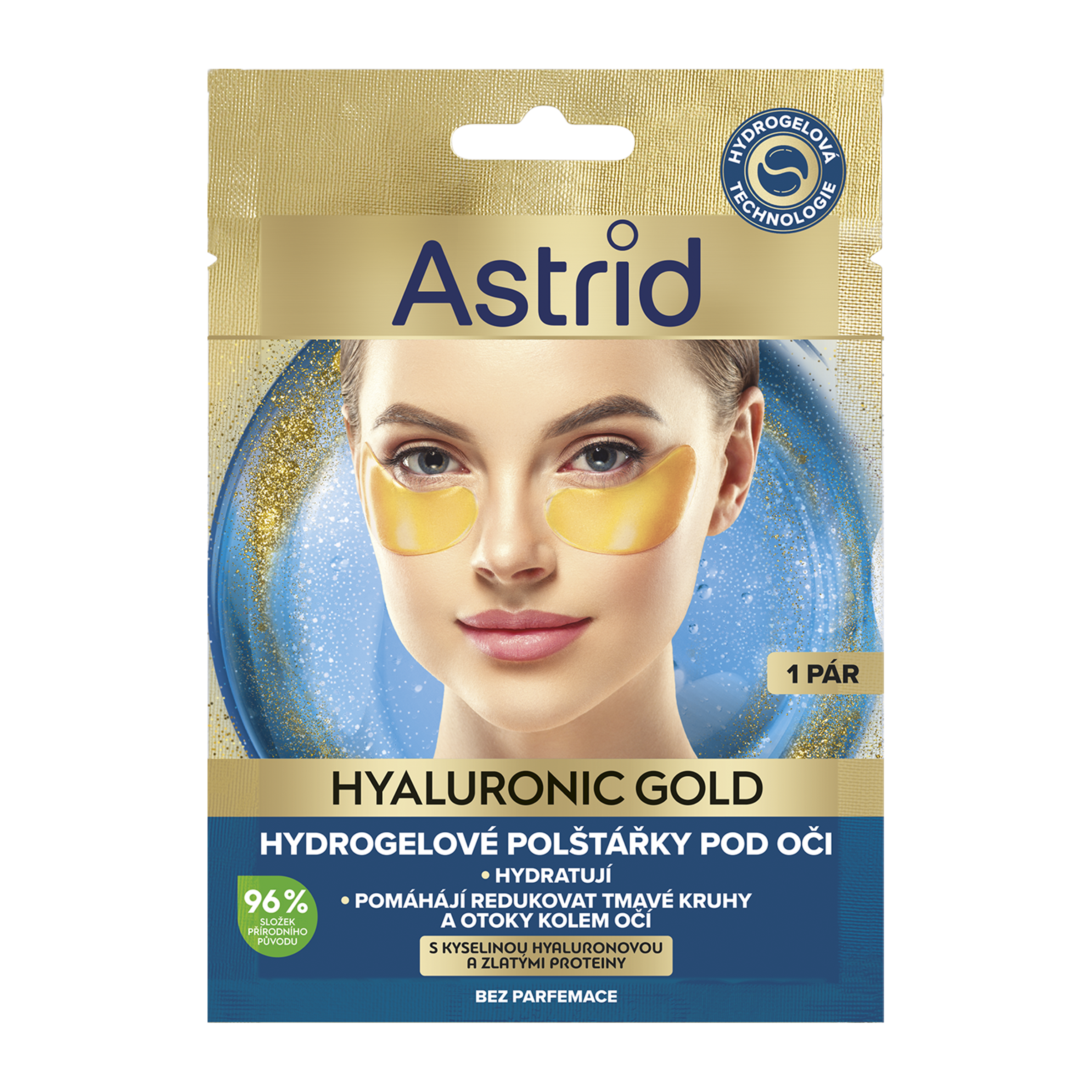 Astrid Hyaluronic Gold hydrogelové polštářky pod oči s 96 % složek přírodního původu jsou obohaceny o kyselinu hyaluronovou a zlaté proteiny, které pomáhají rozjasnit a osvěžit oblast pod očima. Obsažené vitamíny a ceramidy pomáhají udržovat zdravý a mladistvý vzhled vaší pleti. Prokázaná účinnost: Hydratují a redukují oteklé oči a tmavé kruhy. Oční okolí se bude zdát omlazené a revitalizované. (Testy in vivo/sebehodnocení).