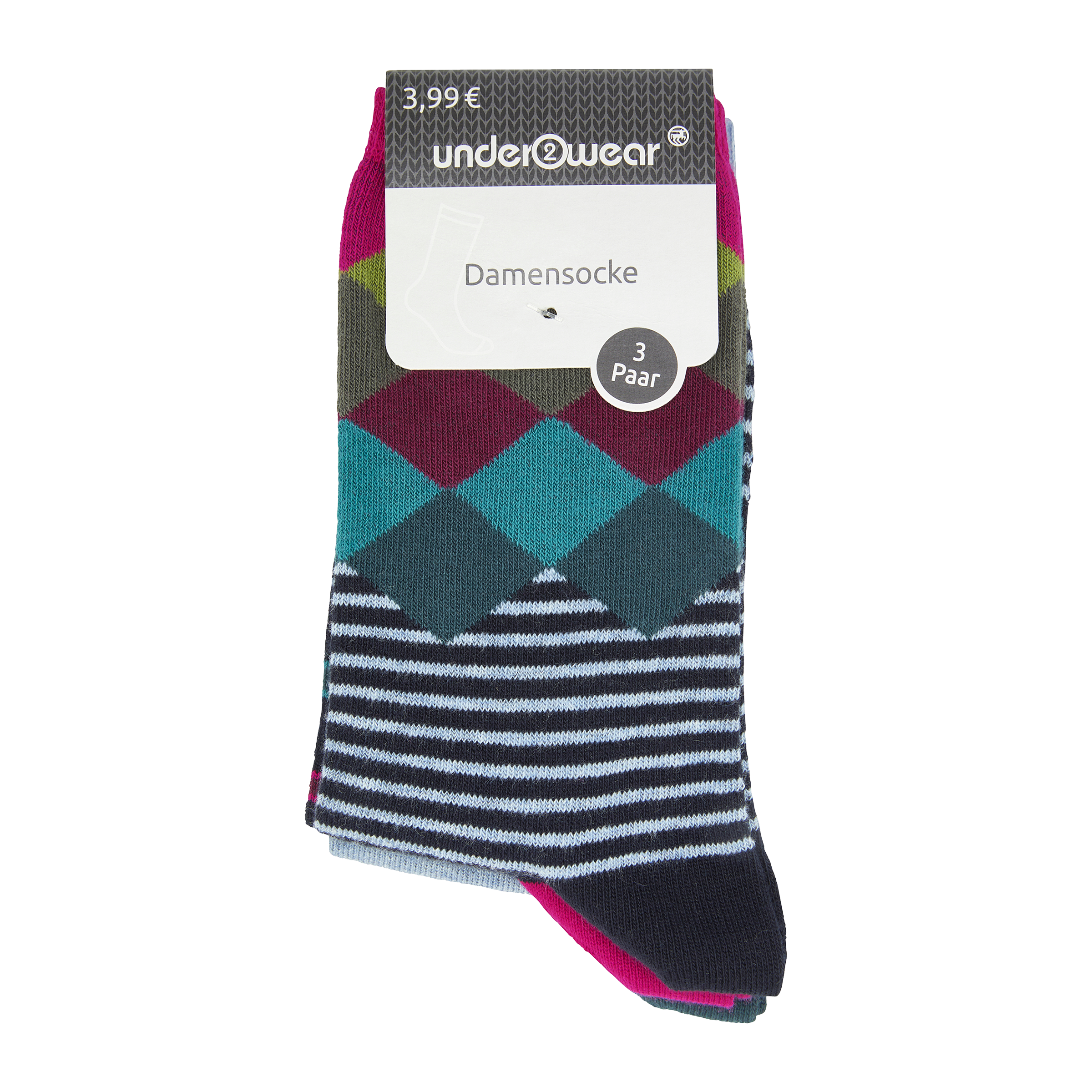 Dámské ponožky, 3 páry – příjemný pocit při nošení díky bavlně. S motivem - proužky a kostky. Vyrobeno v Turecku.