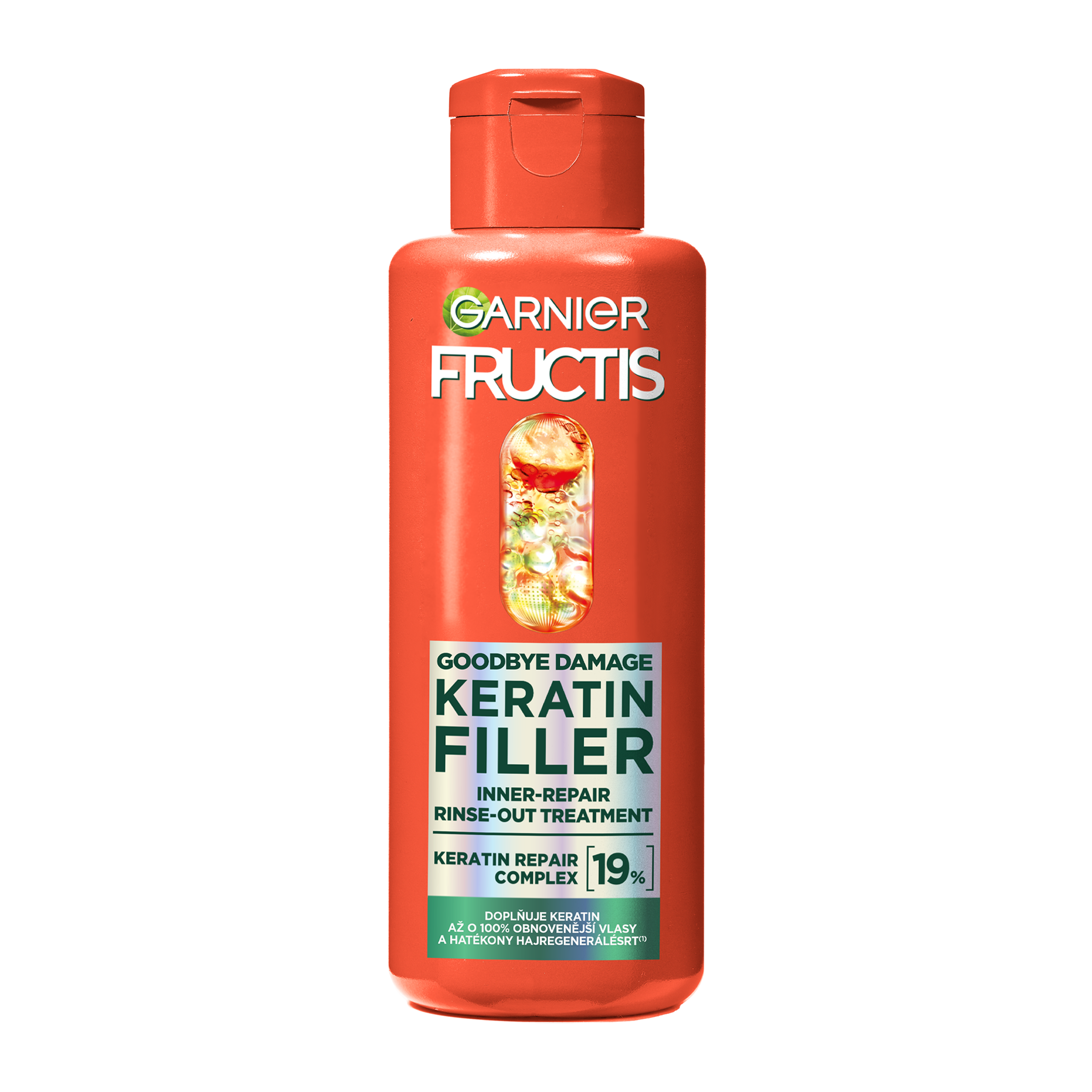 Keratin Filler posilující oplachová péče pro poškozené vlasy (1) s technologií keratinového komplexu. Technologie s 19 % keratinového komplexu a s marulovým olejem doplňuje keratin pro až 100% zregenerované vlasy. Aktivní látka proniká až do hloubky 10 vrstev. Napomáhá vyživovat a posilovat vlasové vlákno. Vlasy jsou viditelně silnější a odolnější. Vlasy mají až o 66 %méně vnitřního poškození (2), jsou až o 77 % vyživenější (3) a až o 89 % odolnější (4).