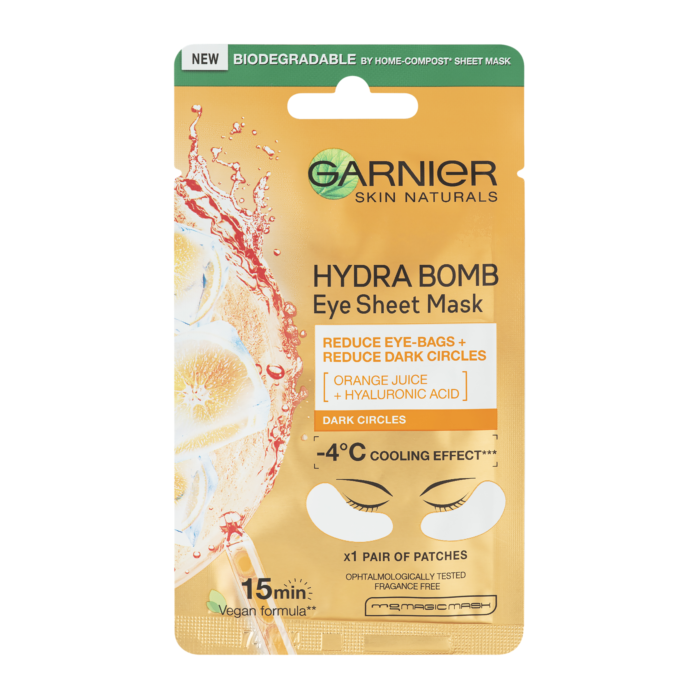 Povzbuzující oční maska Hydra Bomb Garnier Skin Naturals je obohacená o šťávu z pomeranče a kyselinu hyaluronovou. Intenzivně hydratuje, pomáhá redukovat váčky a tmavé kruhy pod očima. Oční oblast je celkově rozjasněná. Maska má chladivý efekt a pro extra chladivý zážitek uchovávejte v lednici. Oční maska povzbuzuje, hydratuje a redukuje váčky a tmavé kruhy pod očima.