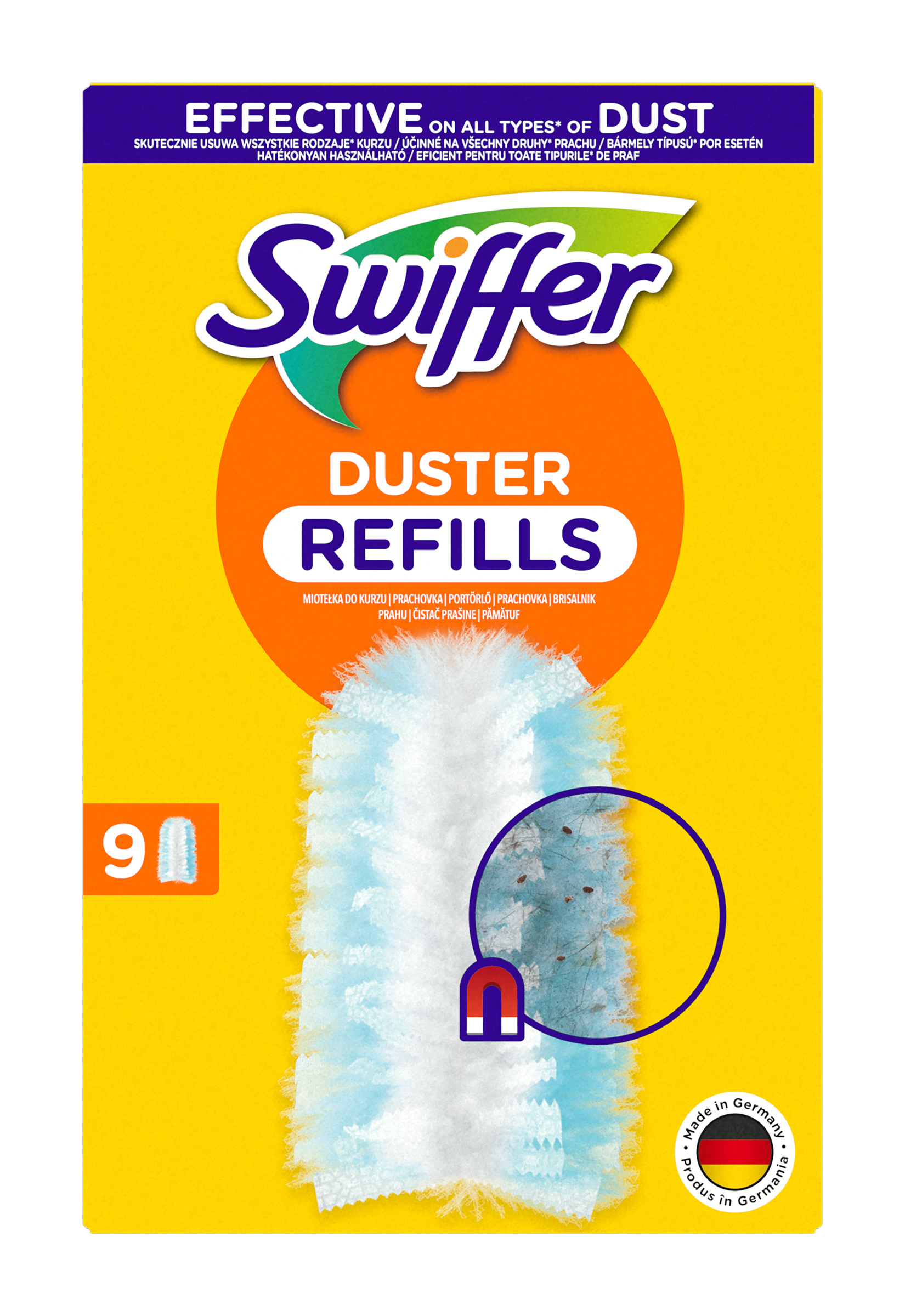 Náhradní prachovky Swiffer Duster jsou díky tisícům nadýchaných vláken, která zachytí prach, nečistoty a chlupy na jakémkoli povrchu jako magnet, účinným nástrojem na všechny typy prachu (jsou účinné na všechny typy prachu v domácnosti), aniž by jej rozptýlily do okolí. Prachovku Swiffer Duster znovu načechrejte a v mžiku se opět pusťte do úklidu. Tipy pro vás: jsou obzvláště vhodné na sbírání chlupů z neustále línajících domácích mazlíčků a pro osoby trpící alergií na prach. Fungují tak dobře, že vás možná začne bavit utírat prach. Náhradní Prachovky Swiffer Duster jsou kompatibilní s krátkou násadou i násadou XXL.