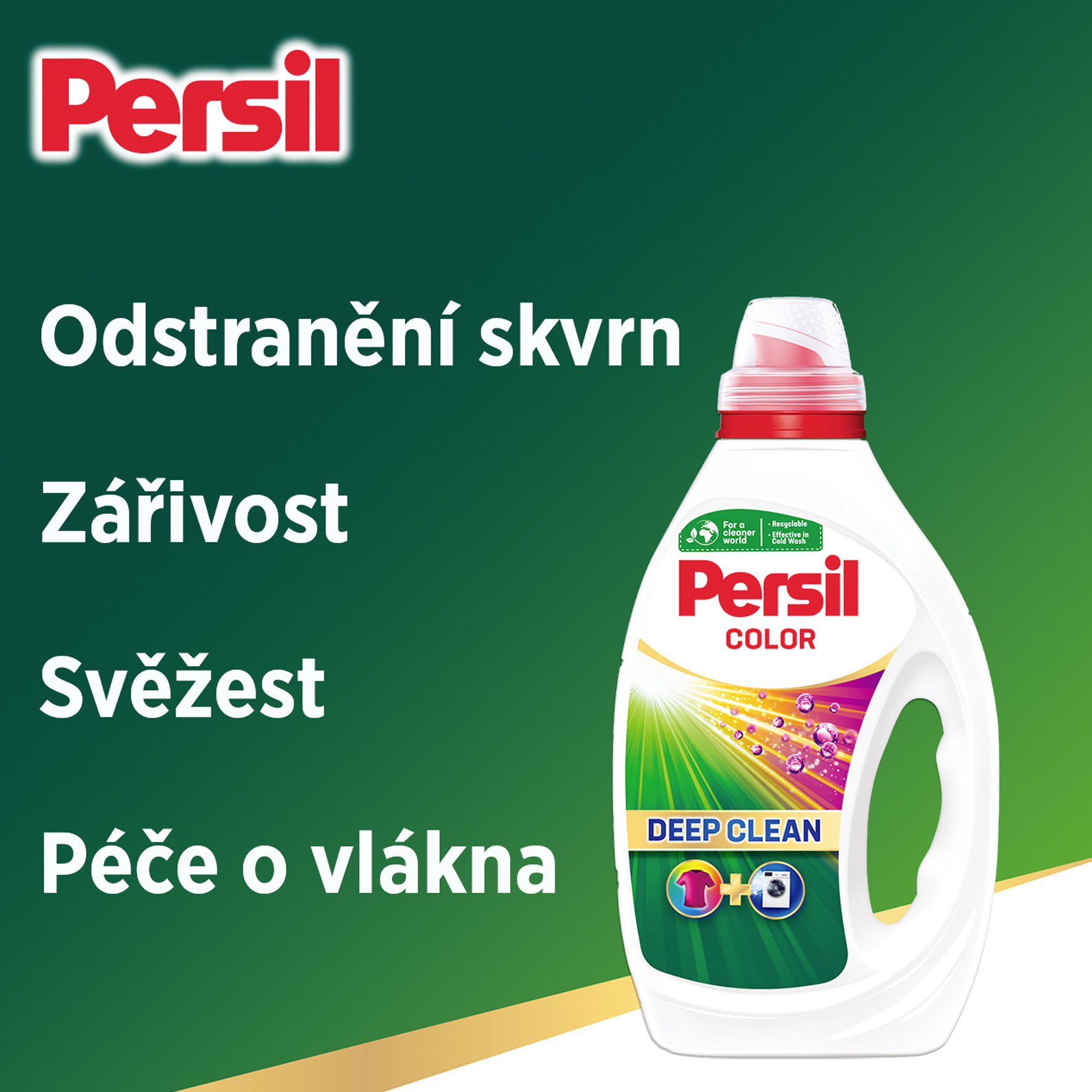 Zažijte hloubkově čisté prádlo a hygienicky svěží pračku I po vyprání může z pračky vycházet nepříjemný zápach, protože po praní znečištěného prádla se v pračce mohou usazovat nečistoty. Pro dosažení opravdové čistoty, kterou pro své oblečení potřebujete, se můžete vždy spolehnout na Persil Deep Clean. Jedinečné složení pracího prostředku proniká hluboko do vláken, kde rozloží i ty nejodolnější skvrny a odstraní je. Složení je navrženo tak, aby vašemu oblečení dodalo pocit svěžesti a čistoty, poté působí hluboko uvnitř mechanismu pračky a odstraňuje nečistoty. které mohou způsobovat nepříjemný zápach.