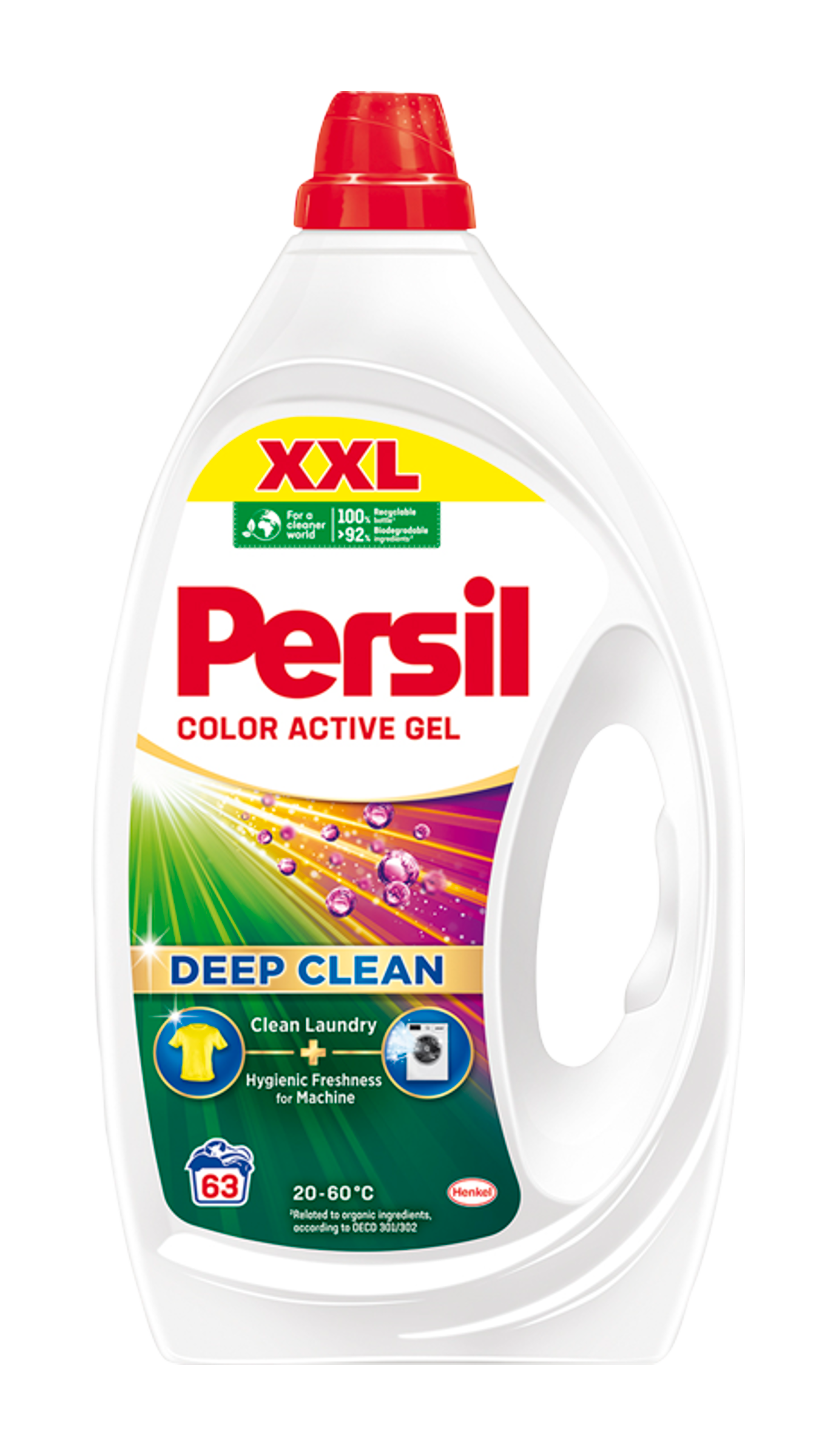 Persil prací gel Color Active - užijte si dokonale čisté prádlo a zářivost barev vašeho oblečení při každém praní. Gel na barevné prádlo pomáhá zachovat jas barev a zároveň poskytuje úžasný čisticí výkon a dodává pračce hygienickou svěžest díky novému složení. Naše složení v tomto gelu pro barevné prádlo je navrženo tak, aby udrželo barvy zářivé a poradilo si i s těmi nejodolnějšími skvrnami. Prací prostředek, který je odolný vůči skvrnám, dokáže být šetrný vůči barvám. Pro čistější svět: Odolný vůči skvrnám, šetrný k barvám i k planetě: složení obsahuje 92 % biologicky odbouratelných složek* a je vyráběno ve 100% recyklovatelném obalu. Účinné při nízkých teplotách - praní ve studené vodě již od 20 °C, aby se šetřila energie při každém praní. Nyní i v budoucnu se Persil zavázal poskytovat skutečně hloubkové čištění prádla a přitom být šetrný k planetě. Šetřete energii díky silnému složení Persil Deep Clean, které přináší efektivní výsledky i při plné pračce a při nízkých teplotách.
