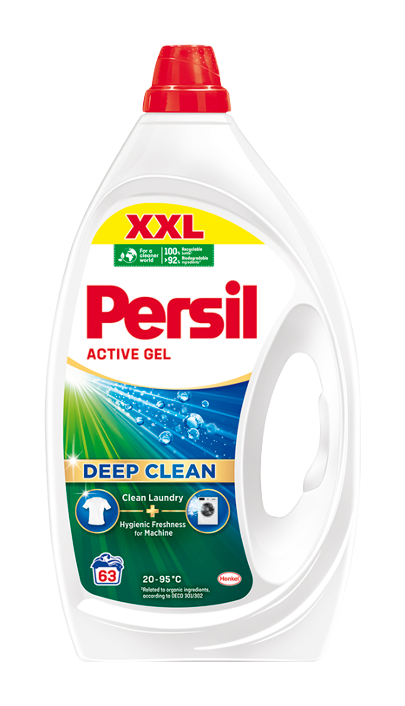 Pro čistější svět: Odolné vůči skvrnám, šetrné k planetě, složení obsahuje 92 % biologicky odbouratelných složek* a je vyráběno ve 100% recyklovatelném obalu. Účinné při nízkých teplotách - praní ve studené vodě začíná při 20 °C, aby se šetřila energie při každém praní. Nyní i v budoucnu se Persil zavázal poskytovat skutečně hloubkové čištění prádla a přitom být šetrný k planetě.
