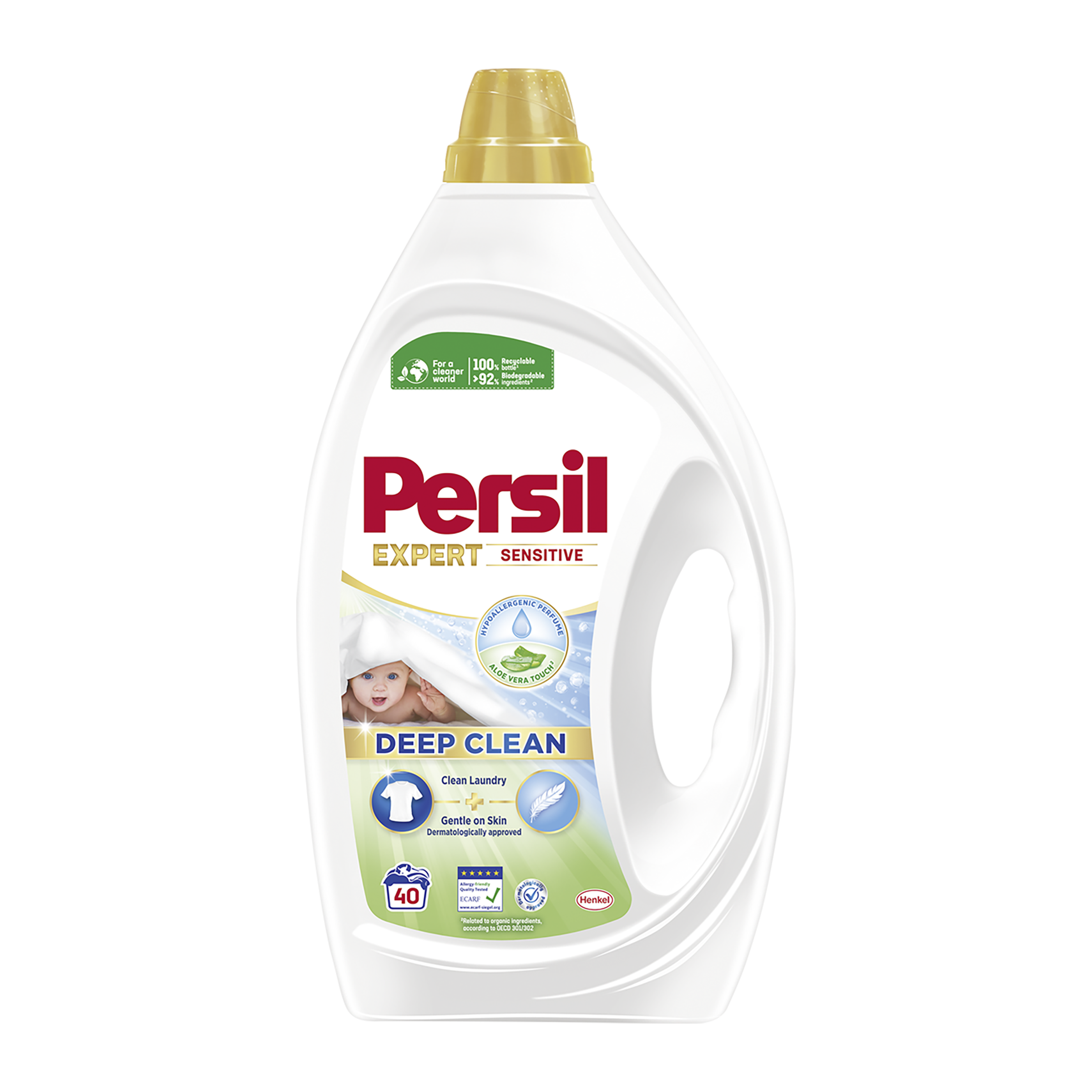 Persil prací gel Sensitive - Zažijte dokonale čisté prádlo a šetrnou péči o vaši pokožku. Persil gel Sensitive byl vyvinut speciálně pro citlivou pokožku. Jemný prací prostředek zajistí nyní víc než jen efektivní odstranění skvrn. Neobsahuje žádná barviva, aby se minimalizovalo riziko podráždění, což z něj činí ideální prací prostředek na dětské nebo kojenecké oblečení. Prací prostředek zajišťuje čistotu pro bílé nebo barevné prádlo a zároveň dodává vašemu oblečení jemnou vůni. Naše složení bylo certifikováno institutem ECARF, aby usnadnilo každodenní život našich spotřebitelů s alergiemi a citlivou pokožkou. Pro čistější svět: Persil prací prostředek je navržen pro odstranění odolných skvrn a nyní je vyráběn ve 100% recyklovatelném obalu a navíc obsahuje 92 %* biologicky rozložitelných složek. Účinné při nízkých teplotách - praní ve studené vodě již od 20 °C, aby se šetřila energie při každém praní. Nyní i v budoucnu se Persil zavázal poskytovat skutečně hloubkové čištění prádla a přitom být šetrný k planetě. Šetřete energii díky silnému složení Persil Deep Clean, které přináší efektivní výsledky i při plné pračce a při nízkých teplotách.