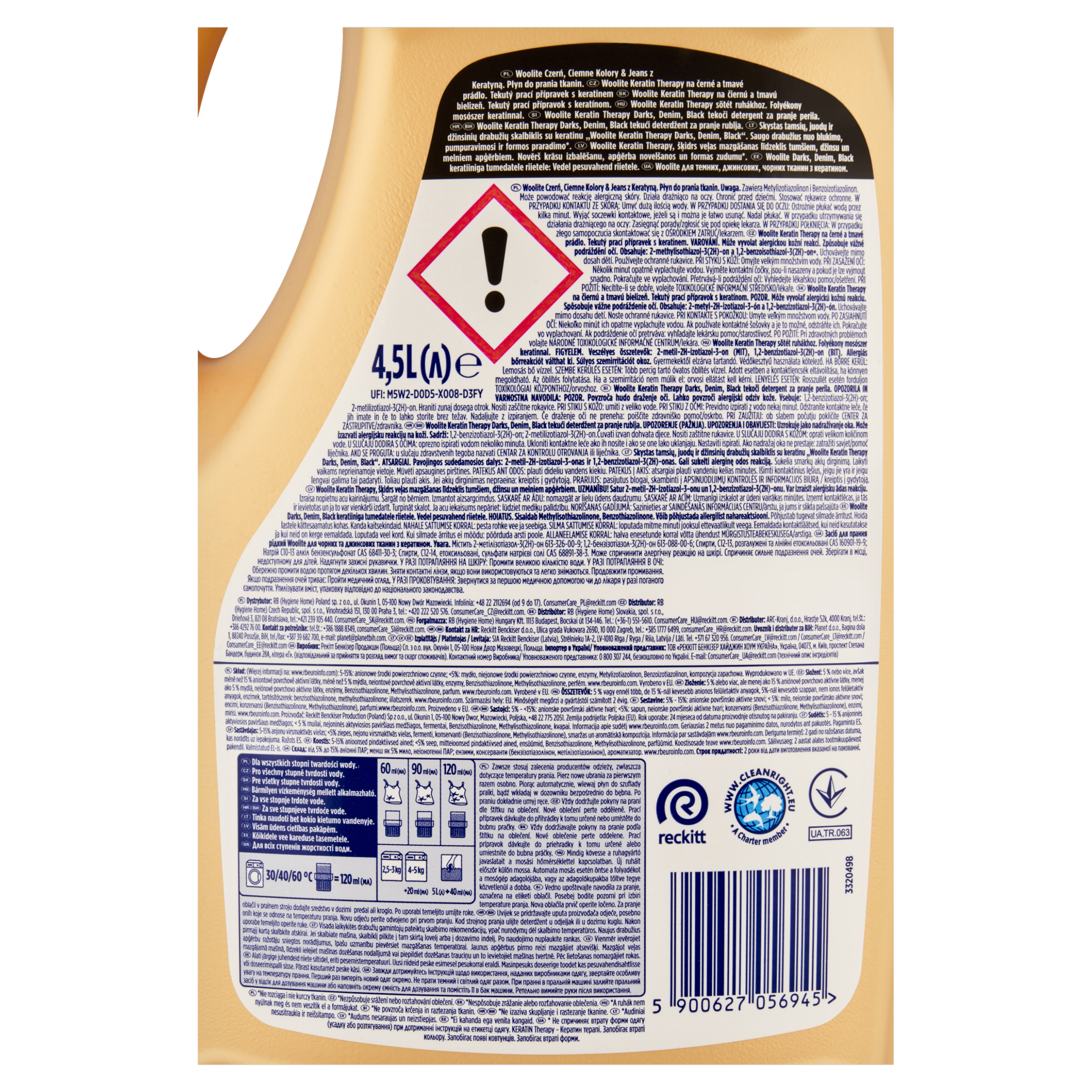 Woolite Keratin Therapy na černé a tmavé prádlo. Tekutý prací přípravek s keratinem. VAROVÁNÍ. Může vyvolat alergickou kožní reakci. Způsobuje vážné podráždění očí. Obsahuje: 2-methylisothiazol-3(2H)-on a 1,2-benzoisothiazol-3(2H)-on+. Uchovávejte mimo dosah dětí. Používejte ochranné rukavice. PŘI STYKU S KŮŽÍ: Omyjte velkým množstvím vody. PŘI ZASAŽENÍ OČÍ: Několik minut opatrně vyplachujte vodou. Vyjměte kontaktní čočky, jsou-li nasazeny a pokud je lze vyjmout snadno. Pokračujte ve vyplachování. Přetrvává-li podráždění očí: Vyhledejte lékařskou pomoc/ošetření. PŘI POŽITÍ: Necítíte-li se dobře, volejte TOXIKOLOGICKÉ INFORMAČNÍ STŘEDISKO/lékaře.