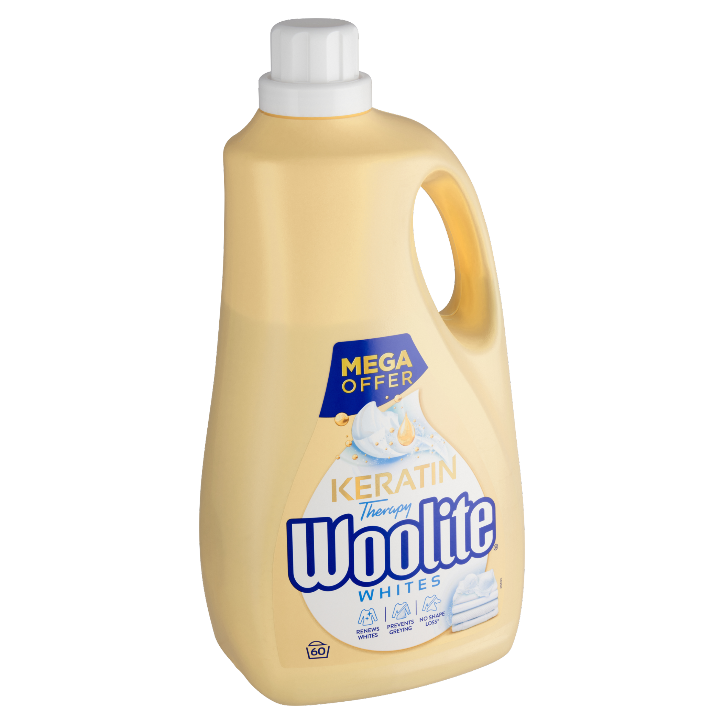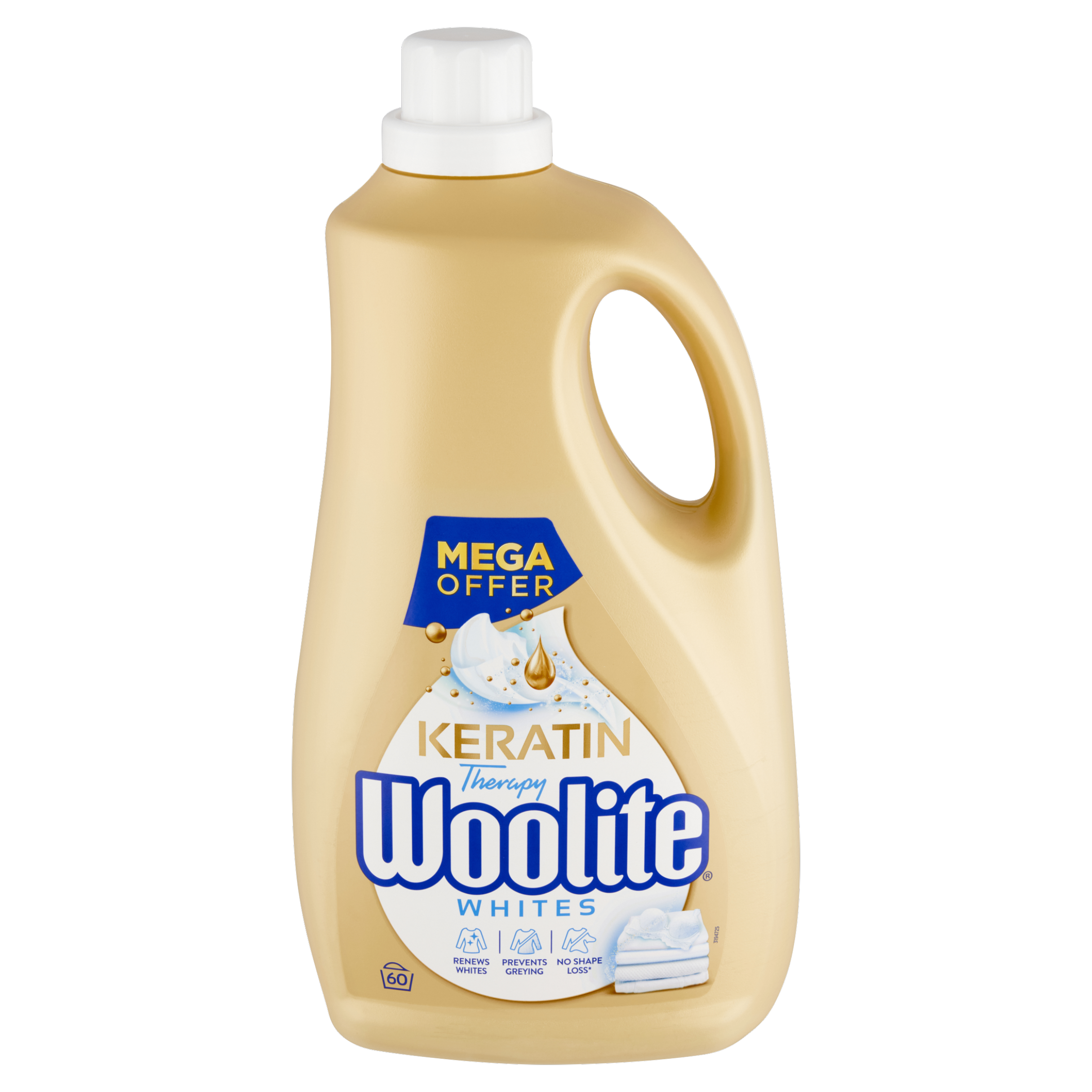 Woolite Keratin Therapy na bílé a světlé prádlo. Tekutý prací přípravek s keratinem.