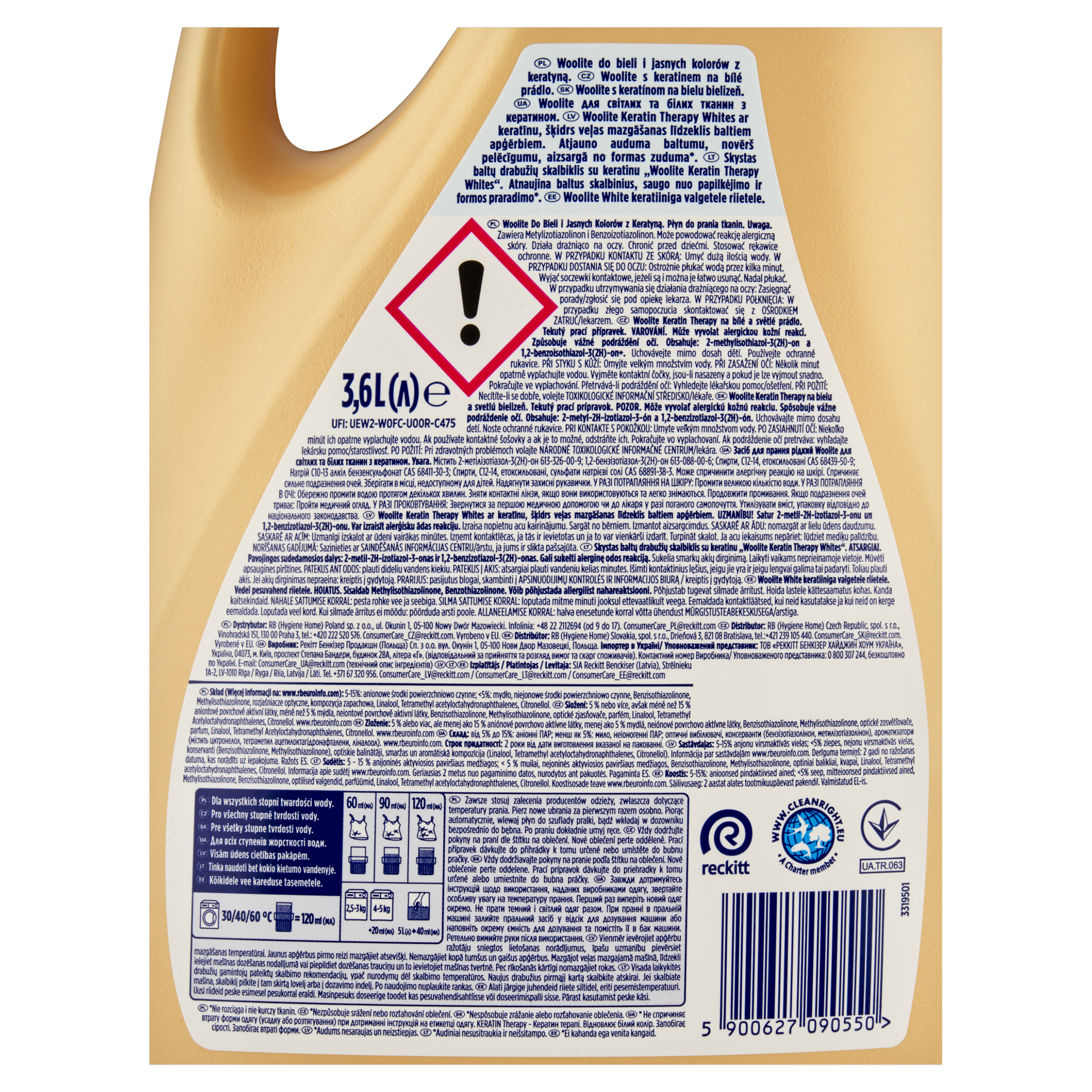 Woolite Keratin Therapy na bílé a světlé prádlo. Tekutý prací přípravek. VAROVÁNÍ. Může vyvolat alergickou kožní reakci. Způsobuje vážné podráždění očí. Obsahuje: 2-methylisothiazol-3(2H)-on a 1,2-benzoisothiazol-3(2H)-on+. Uchovávejte mimo dosah dětí. Používejte ochranné rukavice. PŘI STYKU S KŮŽÍ: Omyjte velkým množstvím vody. PŘI ZASAŽENÍ OČÍ: Několik minut opatrně vyplachujte vodou. Vyjměte kontaktní čočky, jsou-li nasazeny a pokud je lze vyjmout snadno. Pokračujte ve vyplachování. Přetrvává-li podráždění očí: Vyhledejte lékařskou pomoc/ošetření. PŘI POŽITÍ: Necítíte-li se dobře, volejte TOXIKOLOGICKÉ INFORMAČNÍ STŘEDISKO/lékaře.