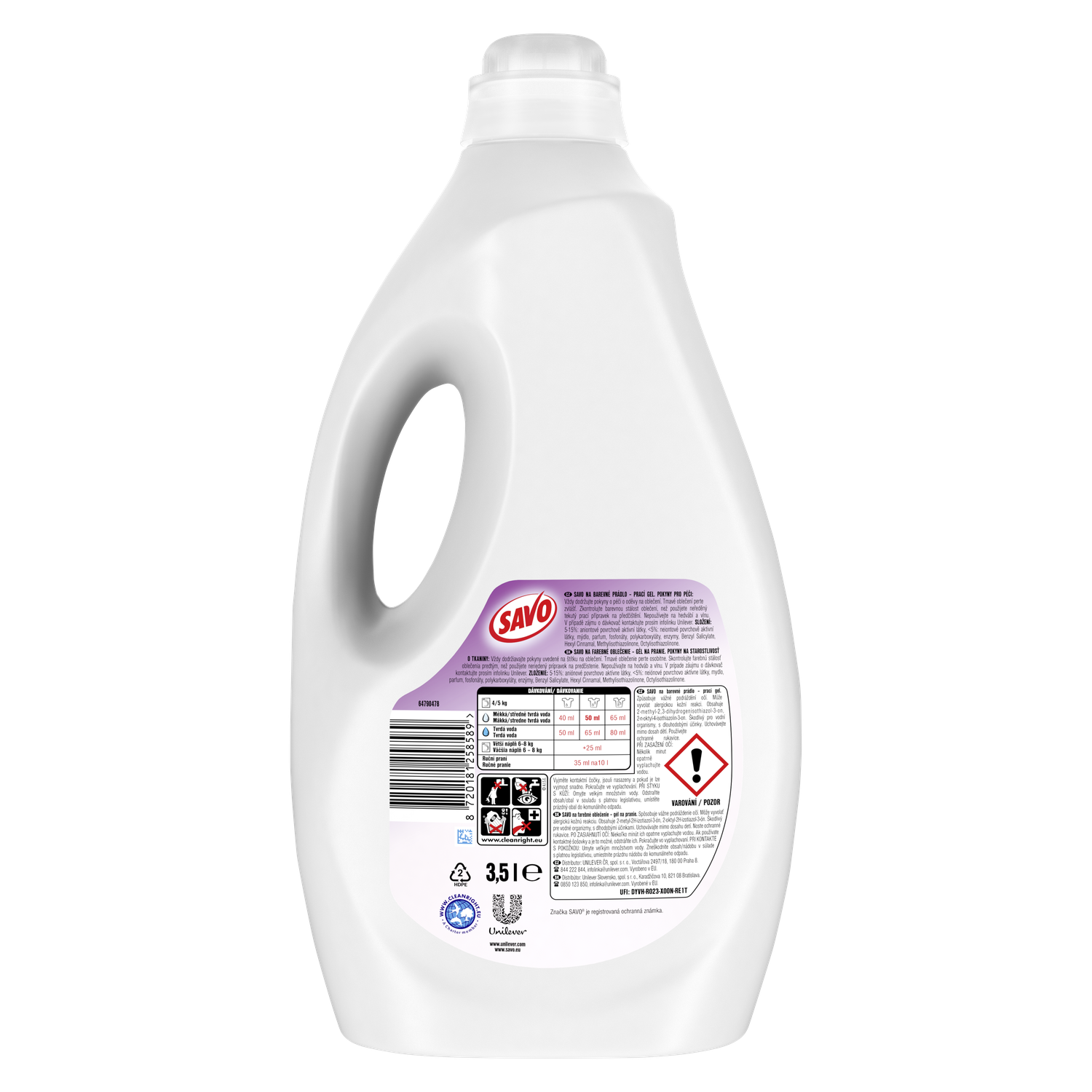 VAROVÁNÍ SAVO na barevné prádlo - prací gel. Způsobuje vážné podráždění očí. Může vyvolat alergickou kožní reakci. Obsahuje 2-methyl-2,3-dihydrogenisothiazol-3-on, 2-n-oktyl-4-isothiazolin-3-on. Škodlivý pro vodní organismy, s dlouhodobými účinky. Uchovávejte mimo dosah dětí. Používejte ochranné rukavice. PŘI ZASAŽENÍ OČÍ: Několik minut opatrně vyplachujte vodou. Vyjměte kontaktní čočky, jsou-li nasazeny a pokud je lze vyjmout snadno. Pokračujte ve vyplachování. PŘI STYKU S KŮŽÍ: Omyjte velkým množstvím vody.