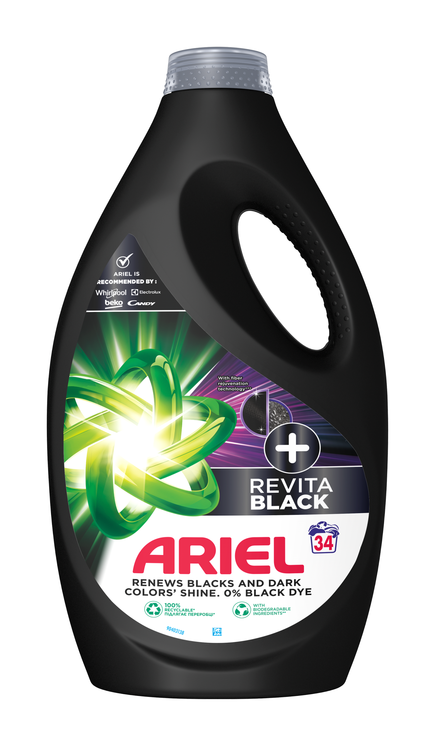 Ariel, který doporučují výrobci značek Whirlpool, Electrolux, Candy a Beko, představuje tekutý prací prostředek Ariel +Revitablack. Eliminuje pachy a obnovuje zářivost černých a tmavých barev. Speciálně navržen pro všechny tmavé barvy - složení přichází s technologií pro obnovení vláken a neobsahuje žádná černá barviva. Tekutý prací prostředek Ariel +Revitablack poskytuje čistoskvoucí výsledky i při nižších teplotách. Složení s jedinečnou technologií COLD BOOST bylo navrženo speciálně pro praní ve studené vodě. Perte na nižší teplotu s tekutým pracím prostředkem Ariel: šetřete energii a snižte emise CO₂ při každém praní prádla. Tekutý prací prostředek Ariel navíc obsahuje 80 % organických složek, které jsou biologicky rozložitelné, a dodává se ve 100% recyklovatelném obalu. Tekutý prací prostředek Ariel +Revitablack můžete také nanést zelenou odměrkou na skvrny a teprve potom vložit prádlo do pračky. Pro dosažení nejlepších výsledků vložte odměrku naplněnou pracím prostředkem přímo do bubnu pračky. Z důvodu ochrany životního prostředí nemají odměrku všechny lahve. Odměrka je dostupná zdarma na webové stránce ariel.info.