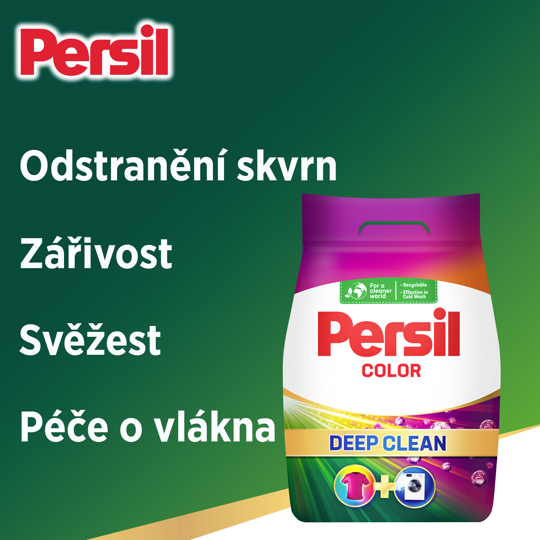 Vysoce účinný prášek PERSIL zajišťuje dokonalý výsledek při praní. Prací prostředek nyní působí i hluboko uvnitř mechanismu pračky, kde bojuje proti nepříjemným pachům a zanechává pračku čistou a hygienicky svěží.