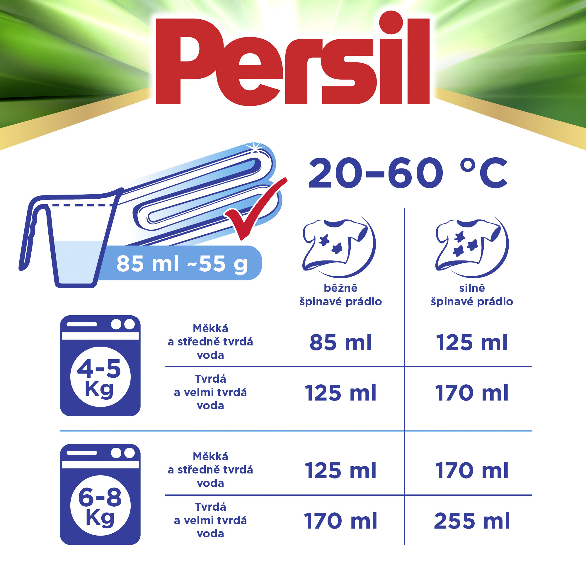 - Praní při nízkých teplotách a úspora energie: Prací prostředek Persil šetří energii při každém praní, a to i při plně naložené pračce a při nízkých teplotách od 20 °C díky svému silnému a účinnému složení.