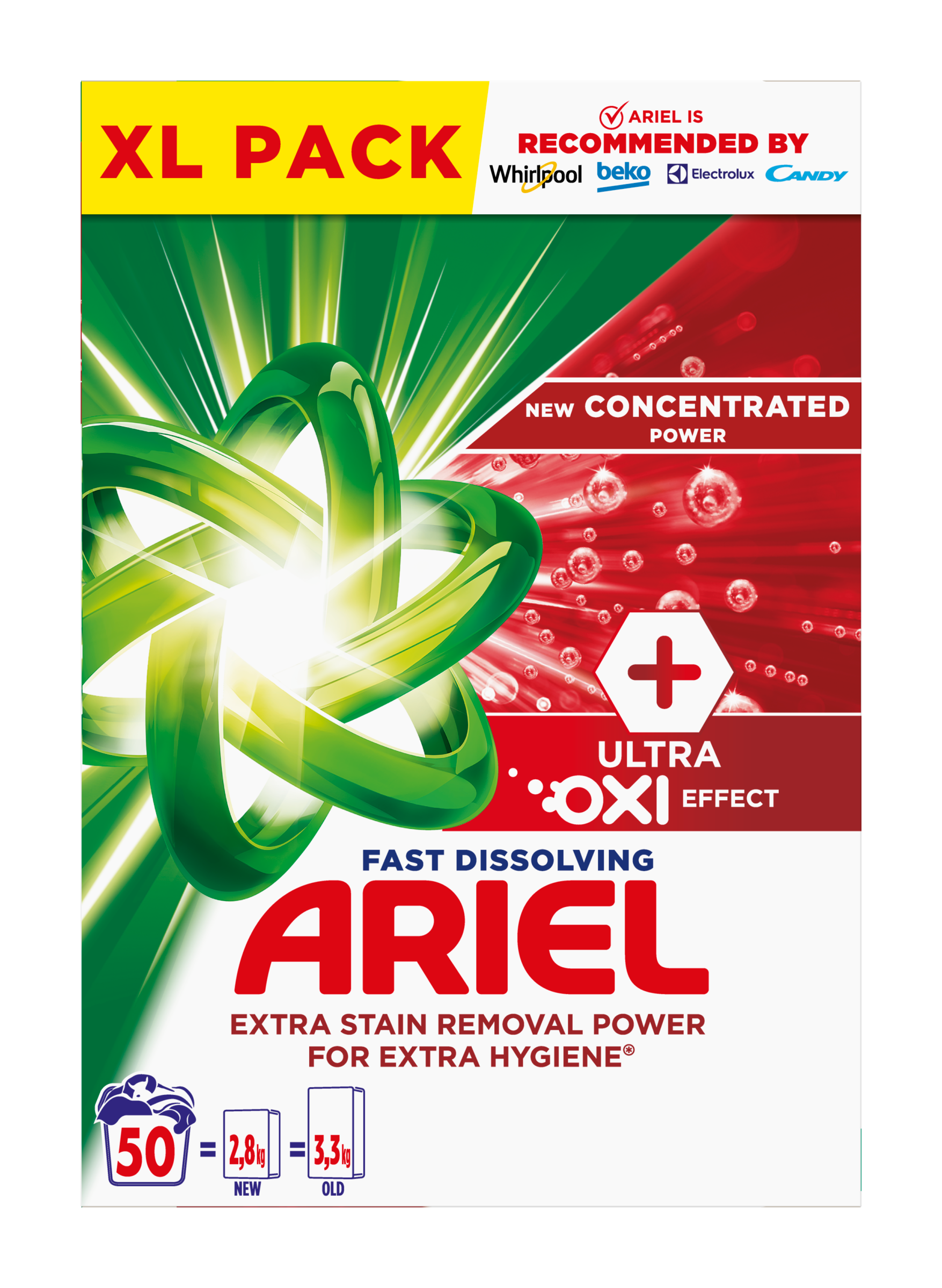 Ariel, značka doporučená výrobci značek Whirlpool, Electrolux, Candy a Beko, představuje prášek na praní Ariel +Ultra Oxi Effect Fast Dissolving. Díky svému koncentrovanému složení poskytuje prášek na praní Ariel silnější účinek a vypere tak více prádla na gram. Ariel +Ultra Oxi Effect přináší vynikající sílu pro odstraňování skvrn a pro extra hygienu (v porovnání s práškem na praní Ariel Mountain Spring) a poskytuje vynikající pocit čistoty i při praní na nižší teplotu. Díky jedinečné technologii rychlého rozpouštění se při kontaktu s vodou okamžitě aktivuje a proniká hluboko do vláken, dokonce i při praní na nižší teplotu. Snižte teplotu praní na 30 °C a ušetřete až 60 % energie. (Spotřeba energie pračky při snížení teploty praní z 60 °C na 30 °C, běžný prací cyklus). Studené prací cykly navíc pomáhají chránit vaše tkaniny déle než při praní v teplé vodě. Jeho složení obsahuje biologicky rozložitelné složky (80 % všech organických složek je biologicky rozložitelných). Prášek na praní Ariel +Ultra Oxi Effect má navíc 100% recyklovatelné kartonové balení vyrobené z papíru s 80% podílem recyklovaného materiálu.