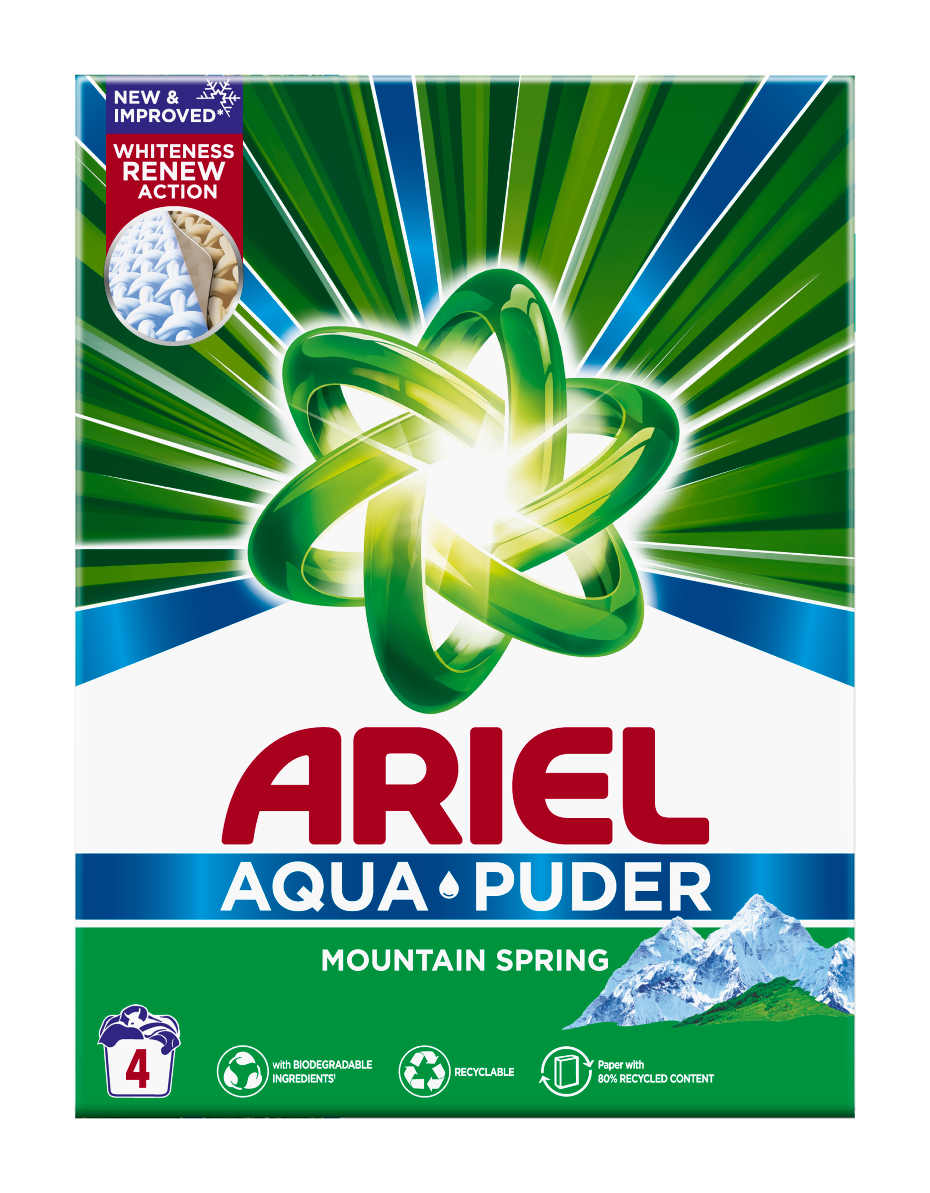 - RECYKLOVATELNÉ OBALY: Prací prášek Ariel má recyklovatelné balení.