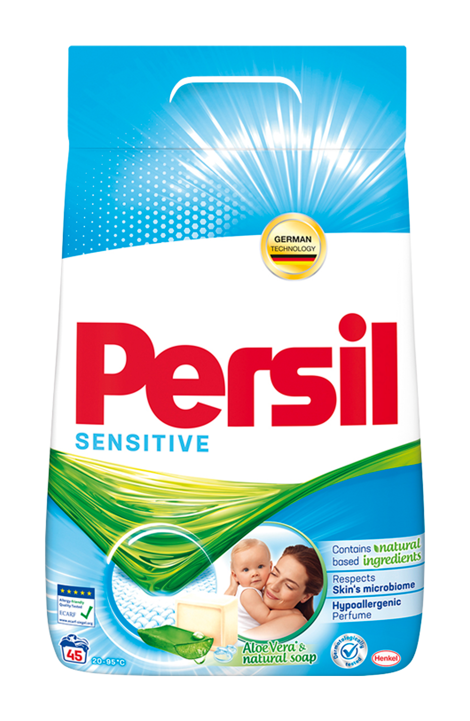 Persil Sensitive - prací prostředek pro citlivou pokožku Persil Sensitive prací prášek je speciálně vyvinut pro osoby s citlivou pokožkou a je vhodný k praní oblečení dětí a alergiků. Pro odstranění textilních chemikálií a jiných škodlivých látek se doporučuje nové oblečení před prvním nošením vyprat. Prací prostředek je dermatologicky testován, respektuje mikrobiom citlivé pokožky a obsahuje složky na přírodní bázi a hypoalergenní parfémování.