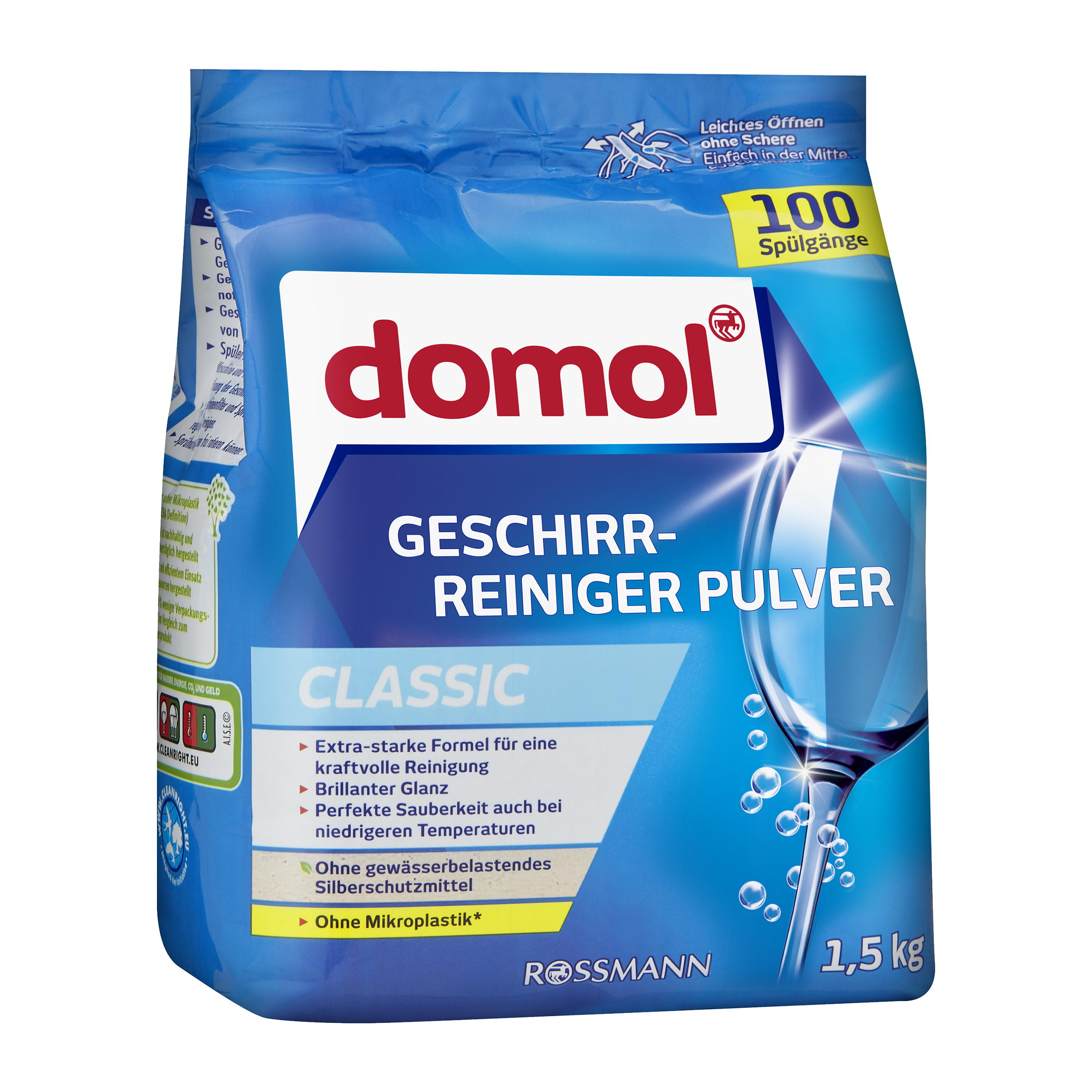 Vhodné pro všechny domácí myčky nádobí. Ručně malované předměty a olověné krystaly by se měly mýt ručně. Hliníkové nádobí, příbory s dřevěnými rukojeťmi nebo dřevěná prkénka nejsou do myčky vhodné. Není vhodné pro mytí stříbrných příborů. Během mycího cyklu může dojít k poškození sklenic třením o sebe. Balení skladujte na chladném, suchém a uzavřeném místě.