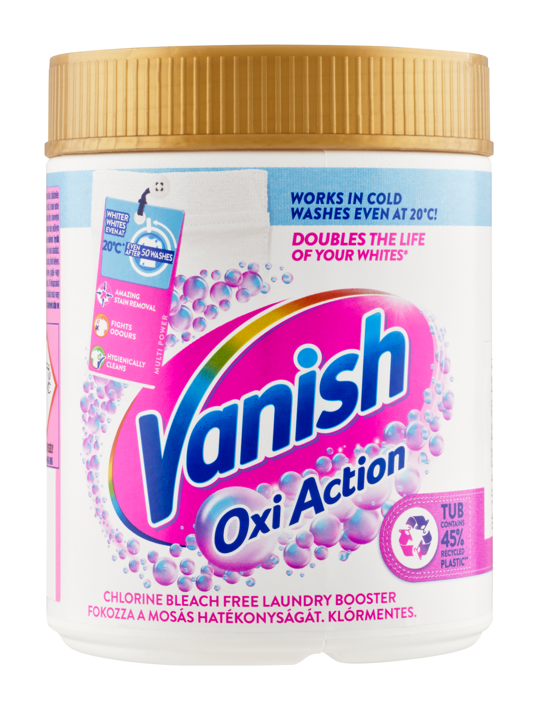Prášek na bělení a odstranění skvrn Vanish Oxi Action spolehlivě rozjasňuje bílé prádlo a obnovuje jeho původní svěžest – i po desítkách pracích cyklů. Díky silnému složení s aktivním kyslíkem efektivně odstraňuje i hluboko usazené skvrny a přitom šetří vlákna. Prášek působí již při nízkých teplotách, takže udrží vaše bílé oblečení jako nové, a to i po opakovaném praní.