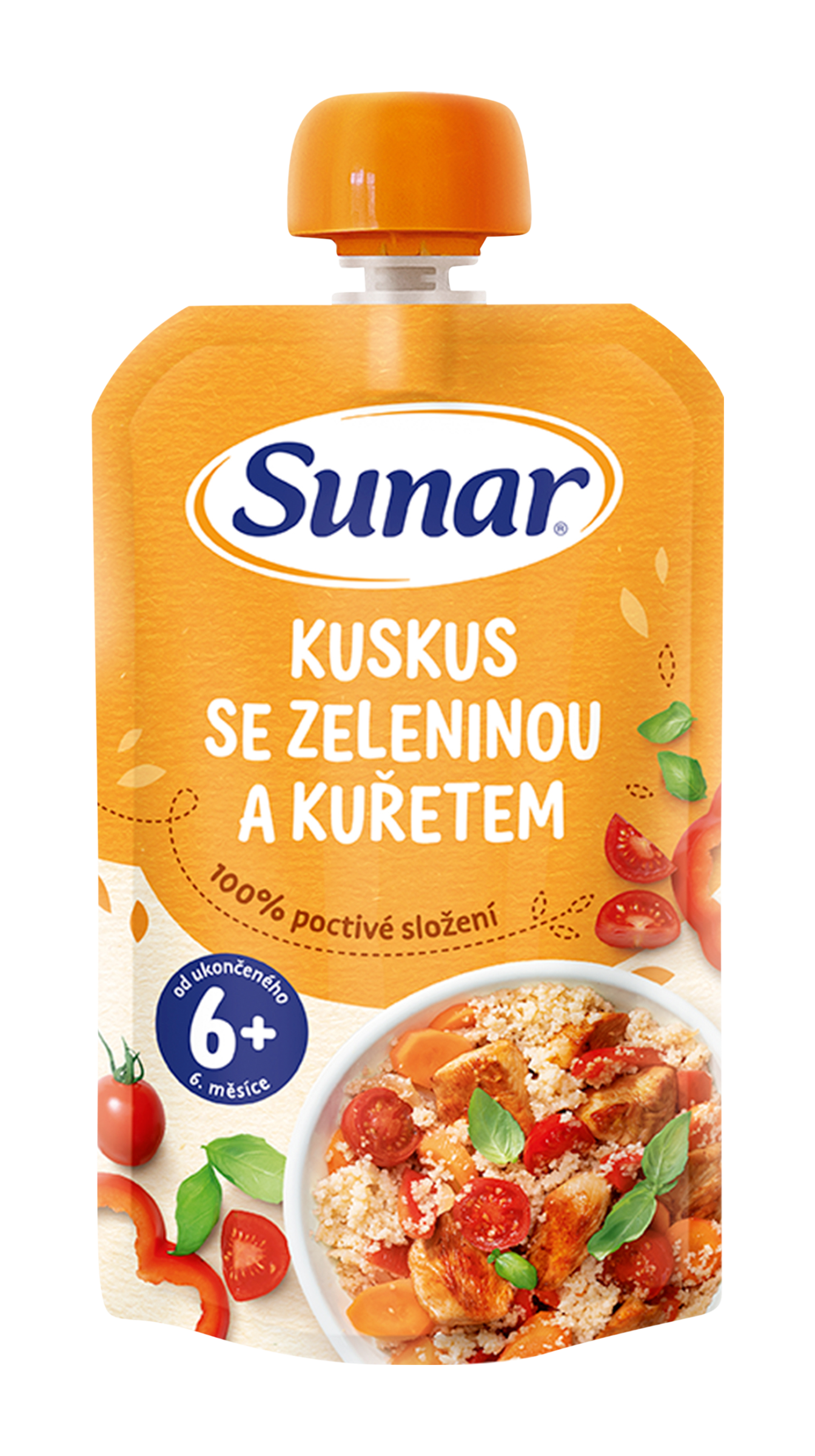 Sunar příkrm Kuskus se zeleninou a kuřetem je hotové jídlo v praktickém obalu, které můžete mít kdykoliv s sebou. Příkrmy vhodný od ukončeného 6. měsíce. Jemná konzistence bez kousků zajistí snadné vytlačení obsahu z kapsičky. Během chvilky můžete servírovat chutné jídlo k obědu či večeři. Bez přidané soli**, ze 100 % poctivých surovin v té nejvyšší baby kvalitě. Navařeno hravě a s chutí.