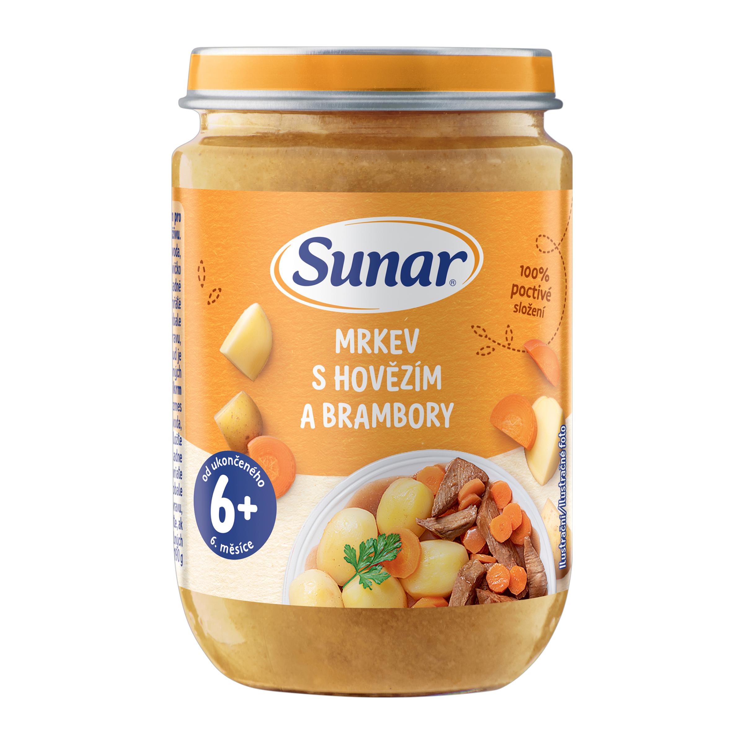 Sunar příkrm Mrkev s hovězím a brambory je ideální volbou k obědu nebo večeři pro děti od ukončeného 6. měsíce. Bez přidané soli, ze 100 % poctivých surovin v té nejvyšší baby kvalitě. Během chvilky máte navařeno hravě a s chutí.