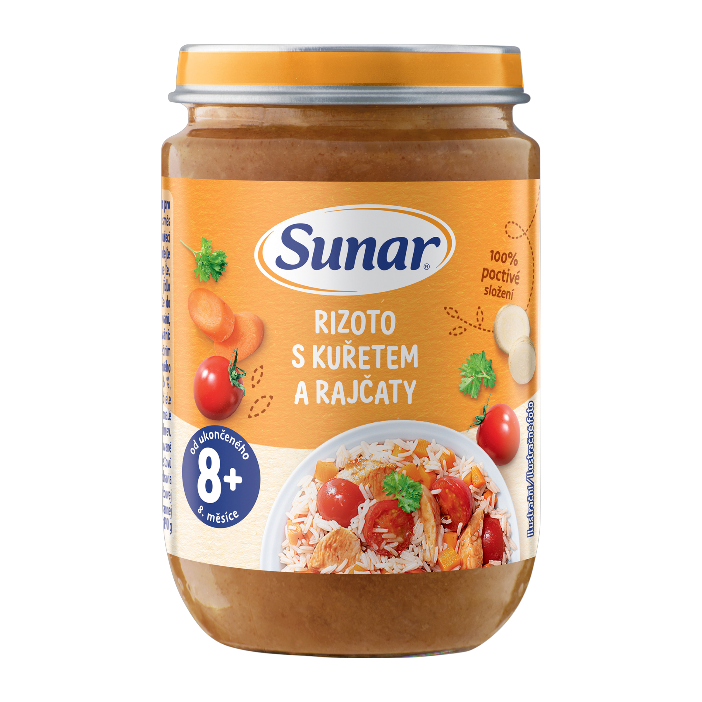 Sunar příkrm Rizoto s kuřetem a rajčaty je vhodný pro děti od ukončeného 8. měsíce. Během chvilky máte navařeno hravě a s chutí. Bez přidané soli, ze 100 % poctivých surovin v té nejvyšší baby kvalitě.