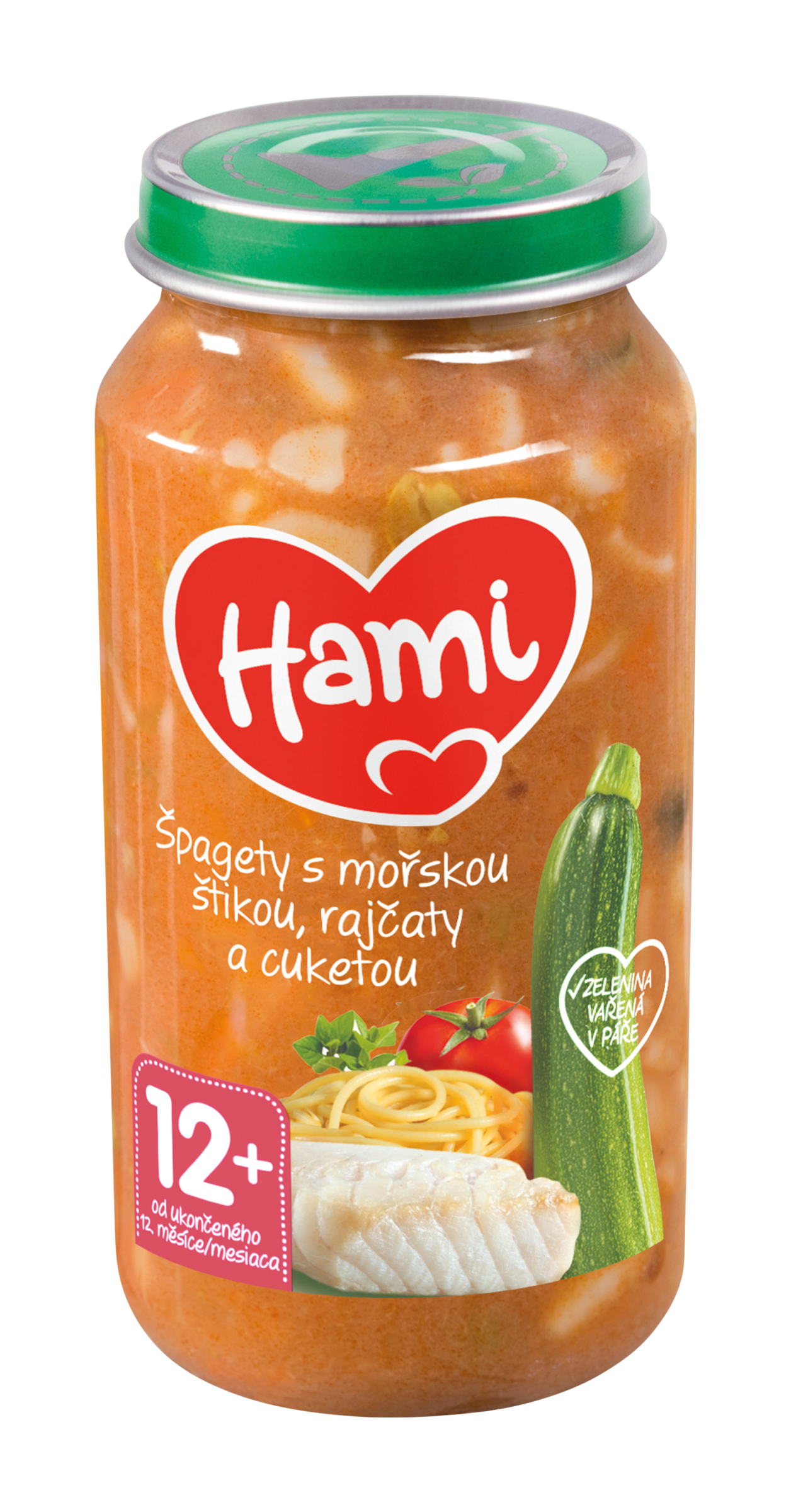 Hami příkrm Špagety s mořskou štikou, rajčaty a cuketou je potravina pro zvláštní výživu určená pro malé děti od ukončeného 12. měsíce věku. Váš drobeček už má za sebou velký kus života a rád by se naučil papat sám. Dokonce už má i první zoubky, a proto je načase do jeho stravy začít přidávat větší měkké kousky masa i ryb a zeleniny. Ideální Hami příkrmy vhodné pro toto období Vašeho drobečka poznáte nejen podle věkového určení na skleničce, ale také pouhým pohledem, kdy uvnitř průhledné skleničky najdete hrubší konzistenci kvalitního masa a zeleniny. Rozmanitý jídelníček je pro malé nezbedy velmi důležitý, proto s Hami příkrmy máte na výběr z kvalitní zeleniny vařené v páře, toho nejlepšího masa pocházejícího z prověřených farem a kvalitních ryb.