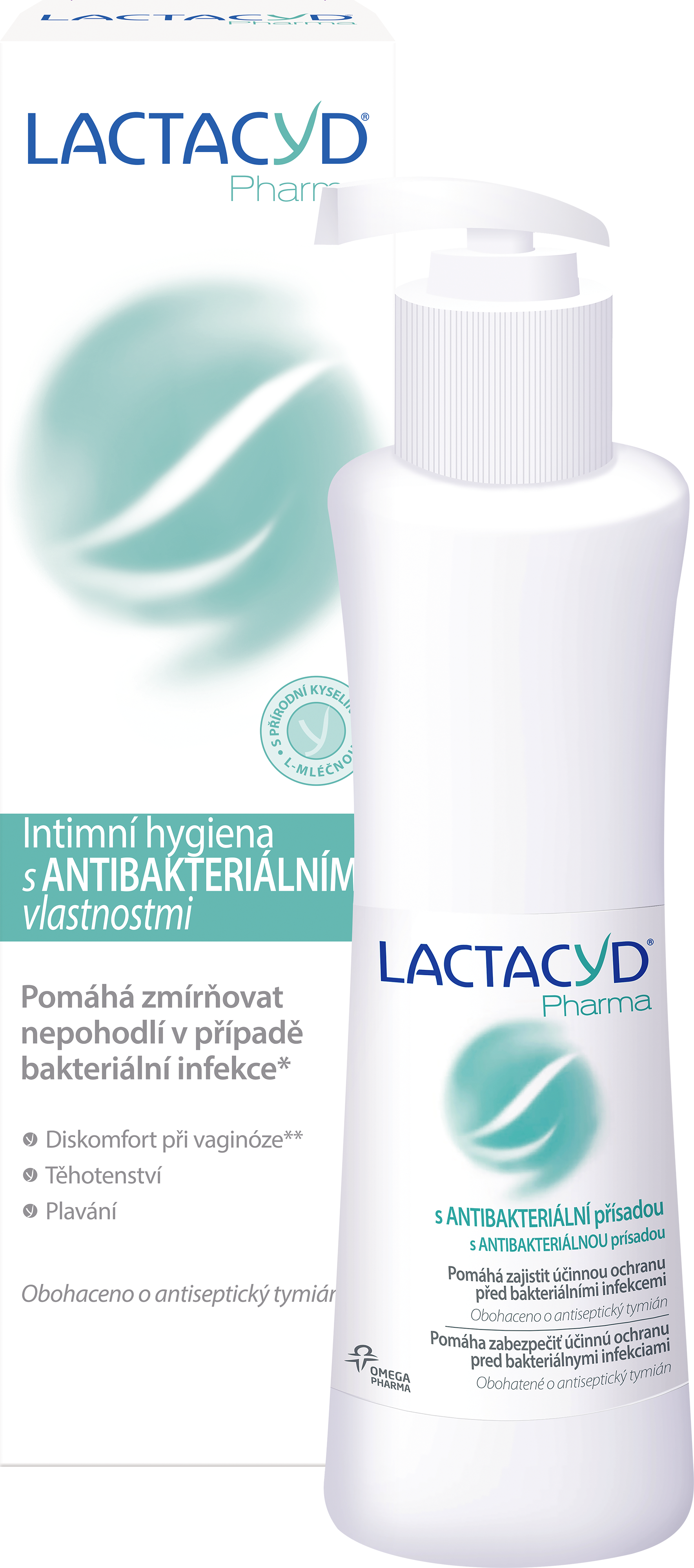 Lactacyd Pharma je speciální řada přípravků pro každodenní intimní hygienu obohacená o přírodní účinné složky s léčebným přínosem. Složení s přírodní kyselinou L-mléčnou a pH 3,5 slouží k šetrnému obnovení přirozené rovnováhy a ochrany vašich intimních partií. Přípravek na intimní hygienu Lactacyd Pharma s antibakteriálními vlastnostmi posiluje přirozenou obranu vašich intimních partií. Přírodní antibakteriální látky vytváří prostředí, které pomáhá zabraňovat růstu špatných bakterií a předchází zápachu. Pomáhá zmírňovat nepohodlí v případě bakteriální infekce*. Diskomfort při vaginóze**. Těhotenství. Plavání.