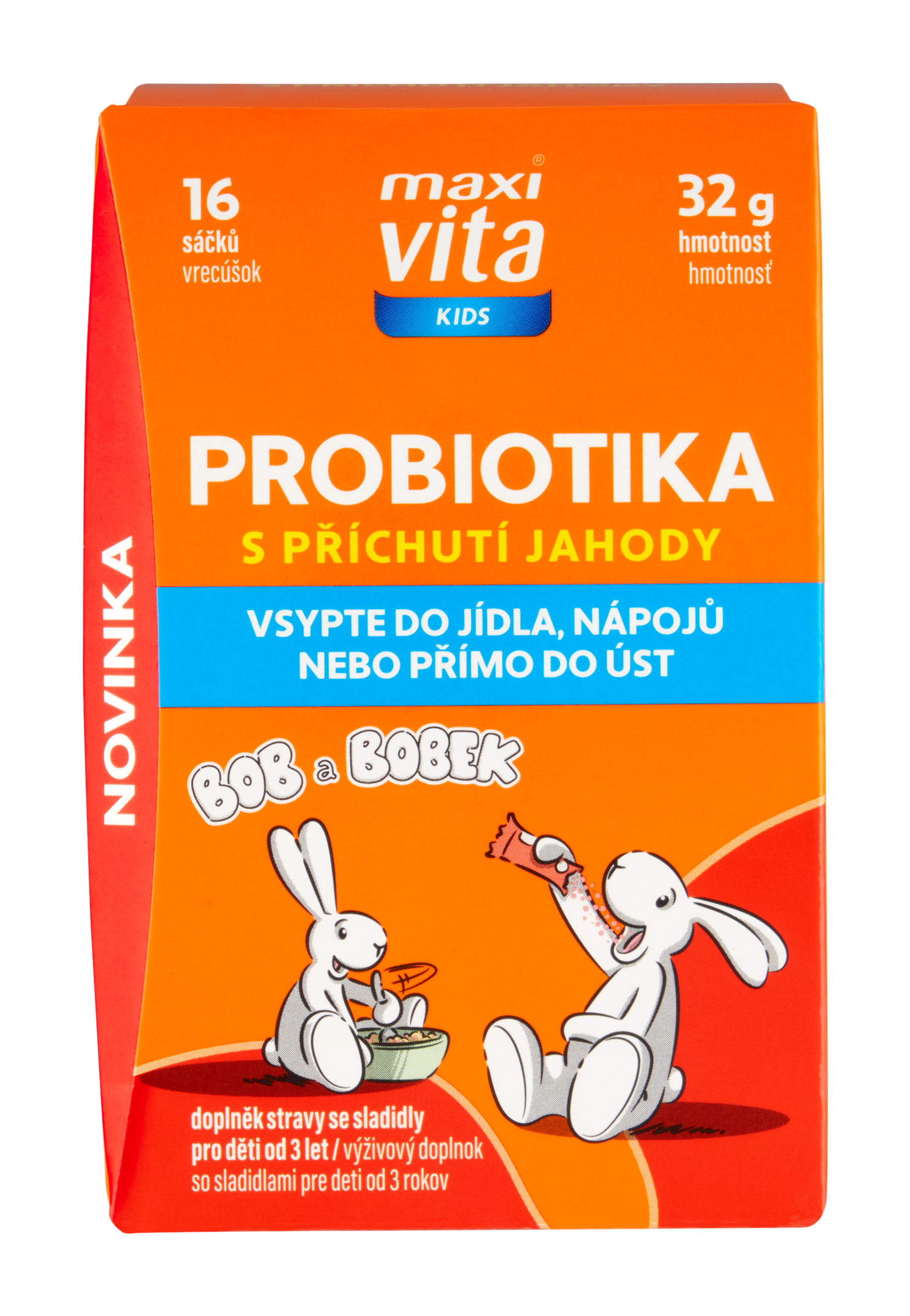 Střevní mikroflóra je přirozenou součástí trávicího traktu, je tvořena velkým množstvím bakterií, které se podílejí na správném zažívání. Harmonie střevní mikroflóry však může být narušena nevhodnou stravou, přemírou cukrů, stresem či užíváním antibiotik. Maxi Vita Kids Probiotika obsahují 5 probiotických kmenů, které mohou střevní mikroflóru obohatit. Některé z nich se vyznačují vysokou stabilitou, jsou odolné vůči vysokým teplotám a kyselému prostředí. Významnou složkou je také prebiotická vláknina GOFOS™, která je pro střevní mikroflóru prospěšná. Pro správnou funkci imunitního systému je důležitý vitamin C a D3, který má příznivý vliv i na zdravý růst a vývin kostí u dětí. Maxi Vita Kids Probiotika nabízí více možností užívání - směs je možné vsypat do jídla, nápojů nebo přímo do úst, kde se přemění na žvýkací hmotu a následně se zcela rozpustí. Děti si jejich jahodovou příchuť zamilují!