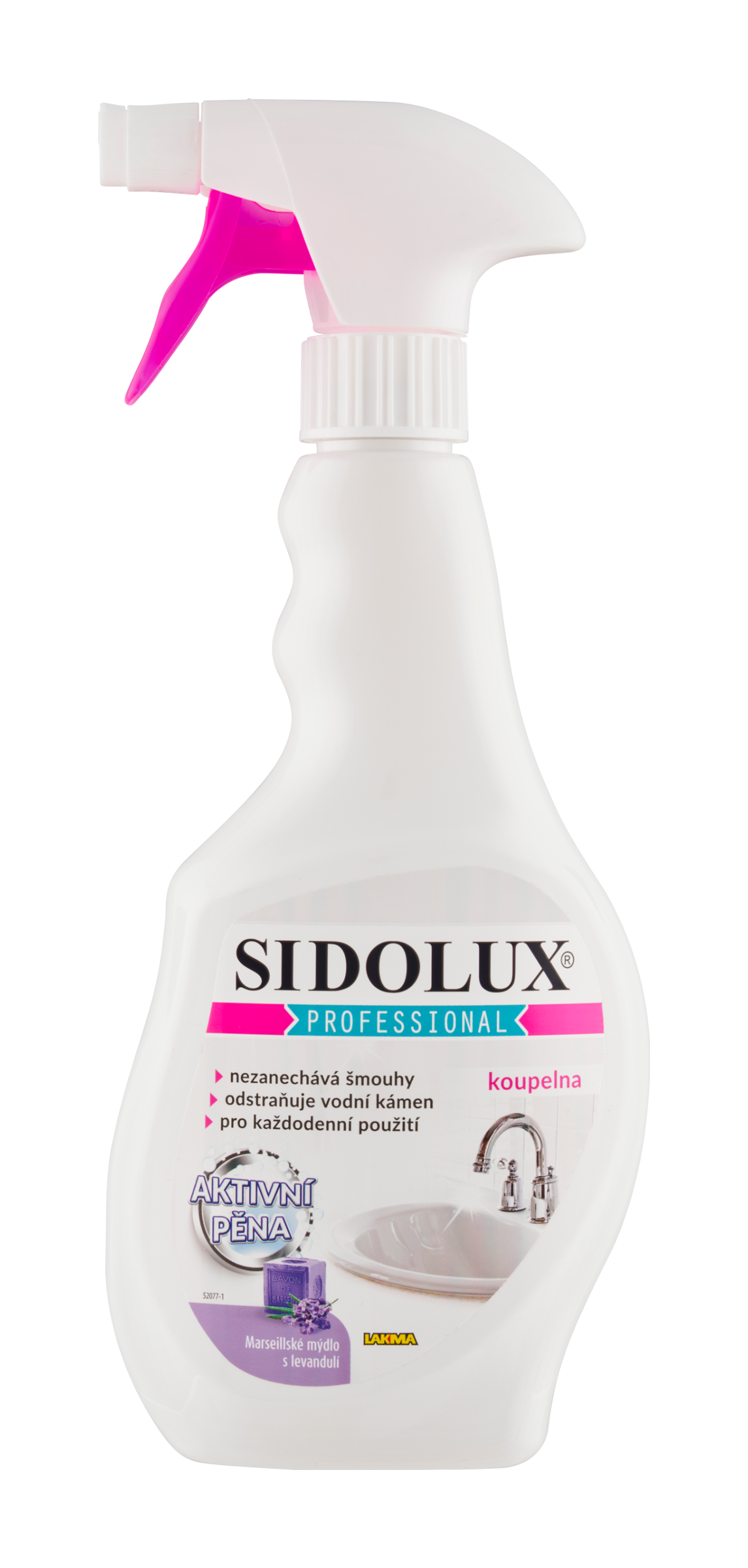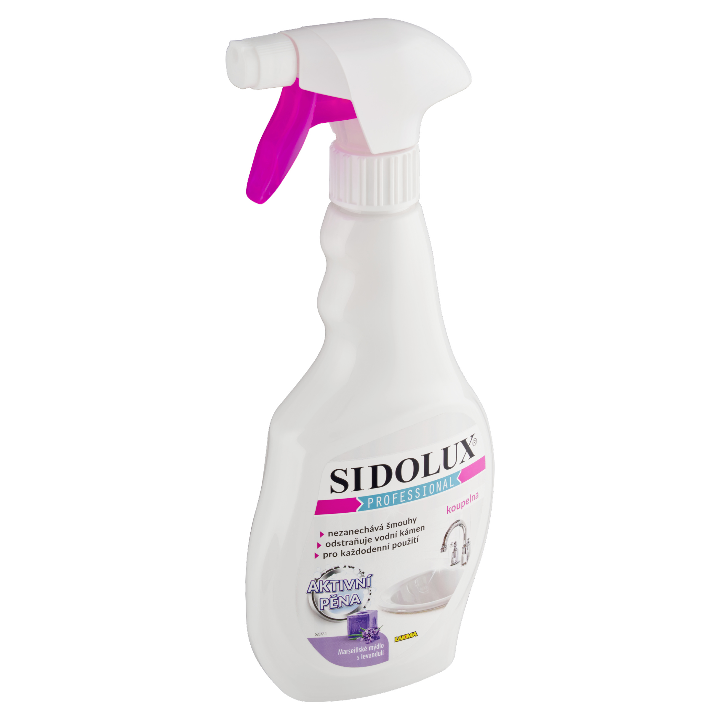 Sidolux Professional koupelna - je určený k udržení hygienické čistoty v koupelnách. Díky speciální receptuře snadno a účinně odstraňuje vodní kámen, zbytky mýdla a jiné nečistoty z vodovodních baterií, sprchových zástěn, umyvadel, van. Prostředek vytváří aktivní pěnu, která delší čas působí na čištěný povrch. Zanechává příjemnou, svěží vůni.
