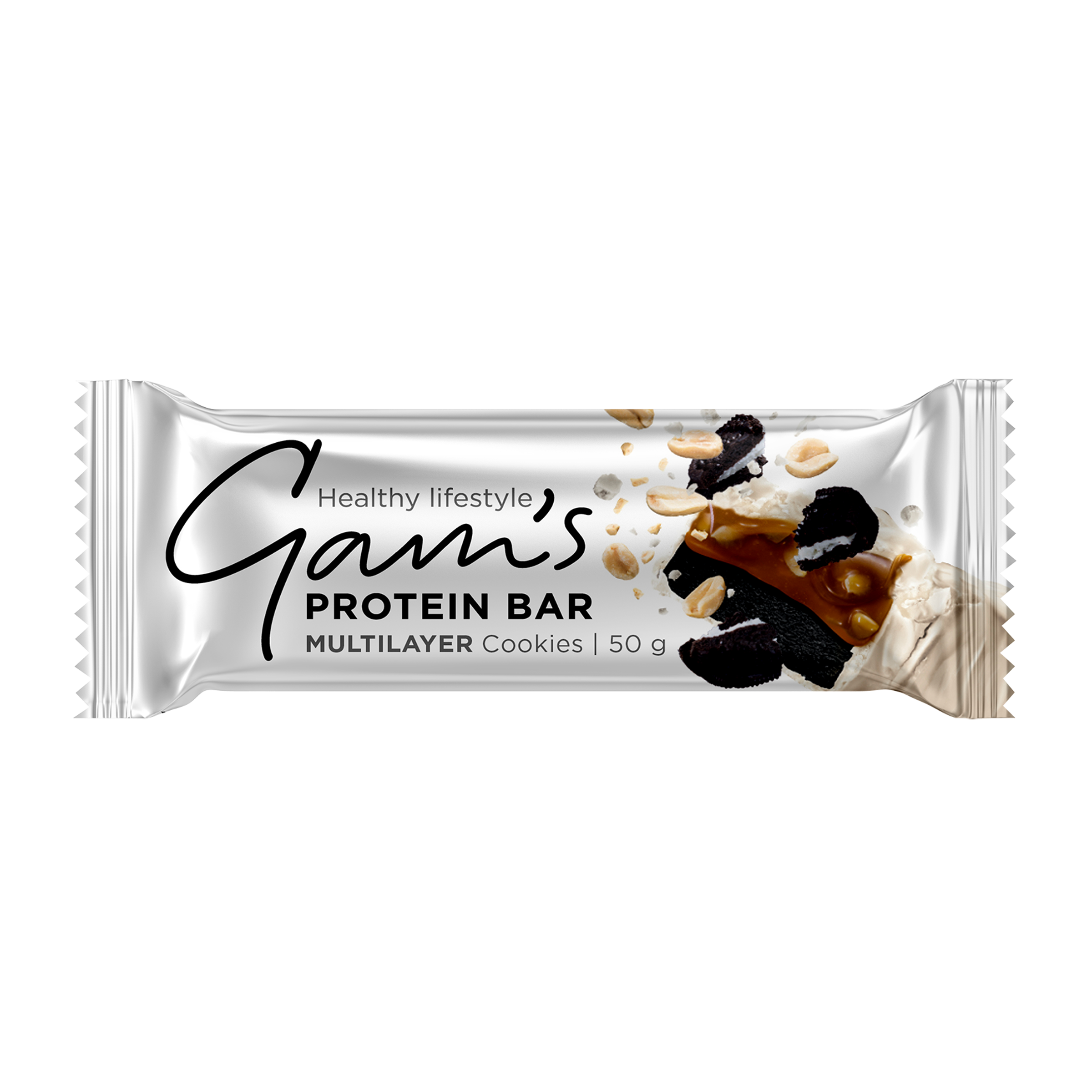Proteinová tyčinka s příchutí cookies, pastou s karamelovou příchutí a praženými arašídy v bílé polevě s proteinem.