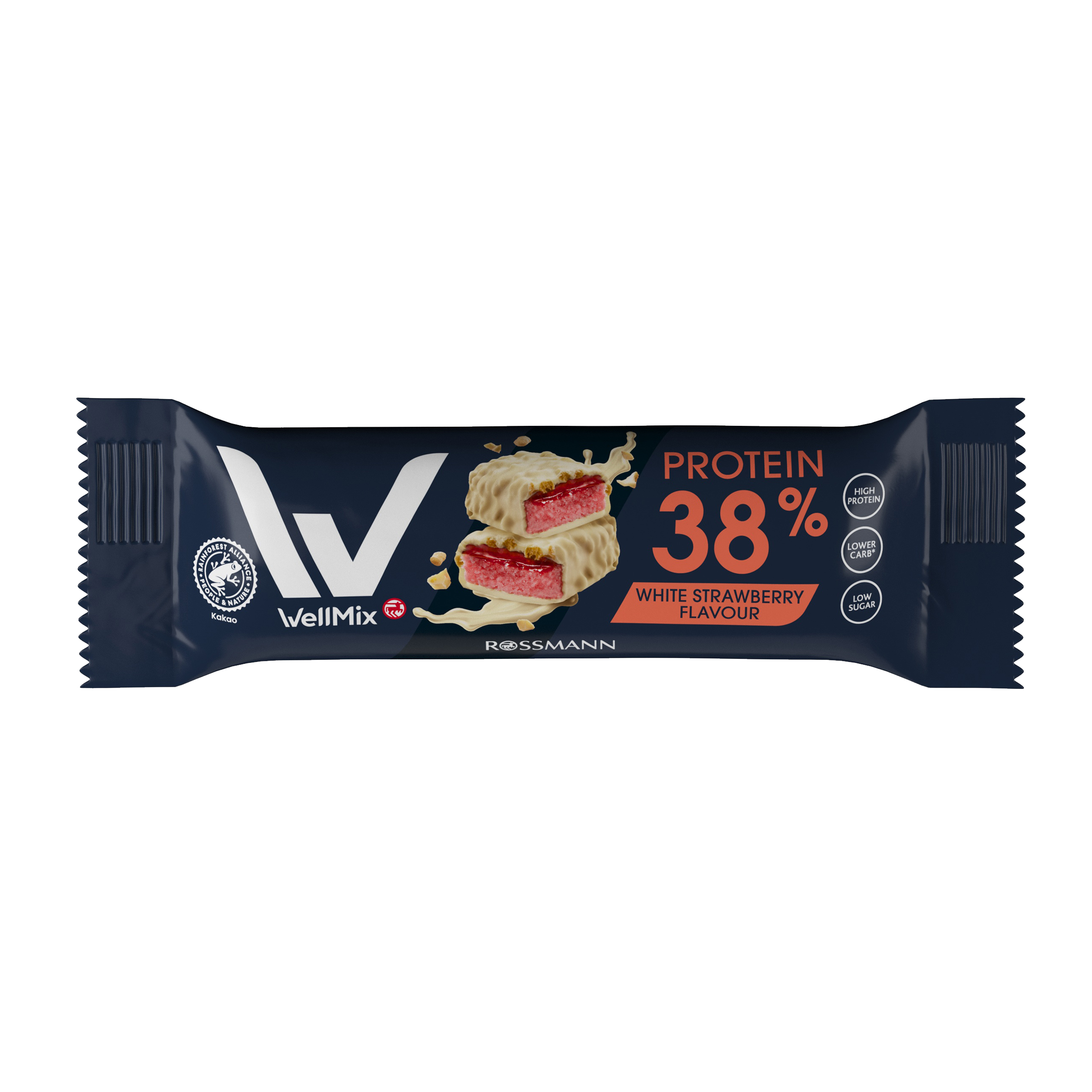 Lahodná kombinace sladké jahodové příchuti a krémové bílé čokolády – ideální svačina pro všechny, kdo chtějí mlsat s rozumem. Proteinová tyčinka WellMix obsahuje 38 % kvalitních bílkovin, které přispívají k regeneraci a udržení svalové hmoty, a zároveň má nízký obsah cukru i sacharidů. Je vhodná po cvičení, na cesty i jako rychlé občerstvení během dne. Křupavá poleva a jemná chuť jahod vás mile překvapí.