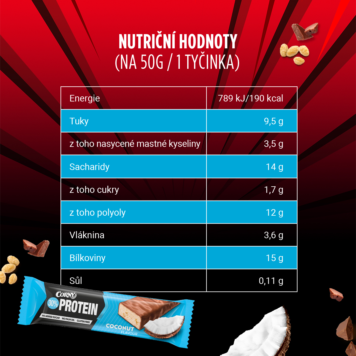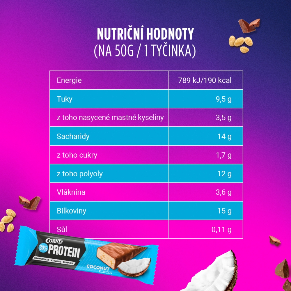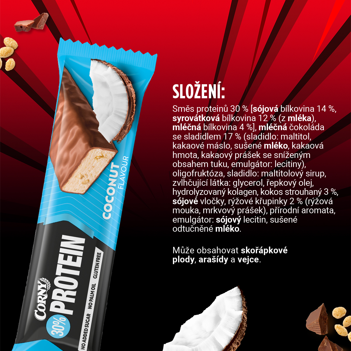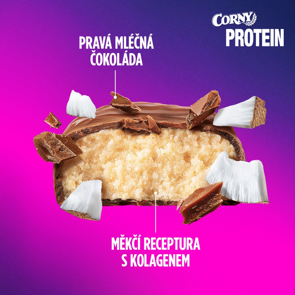 CORNY 30% Protein Kokos Ideální svačinka, pokud žiješ aktivním životním stylem a nechceš dělat kompromis v chuti. Kousky kokosu v CORNY proteinových tyčinkách vytváří jedinečnou chuť, která tě dostane. Dosáhli jsme měkčí a vláčnější textury díky kolagenu, což tě zaručeně potěší. Potřebuješ rychle doplnit energii? Corny proteinová tyčinka je díky svým benefitům ideální volba.