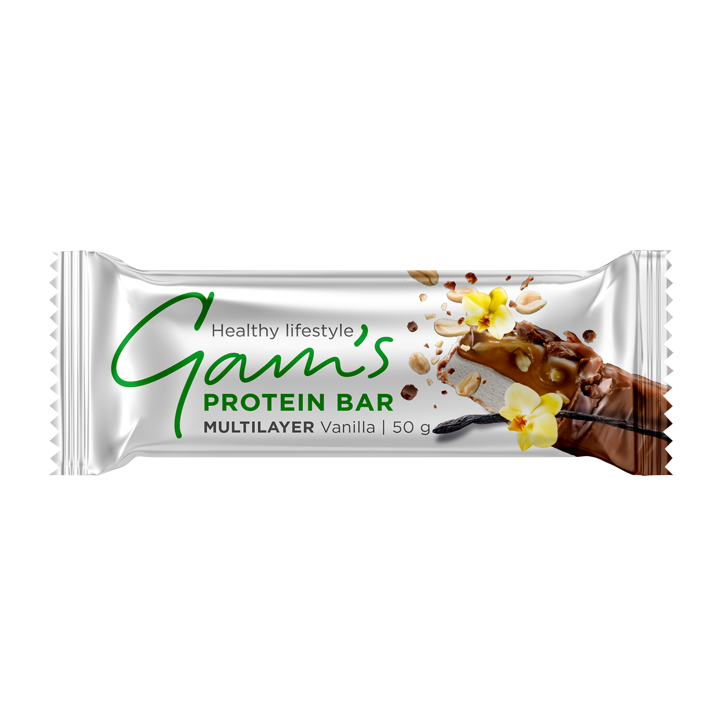 Proteinová tyčinka s vanilkovou příchutí, pastou s karamelovou příchutí a praženými arašídy v mléčné polevě s proteinem.