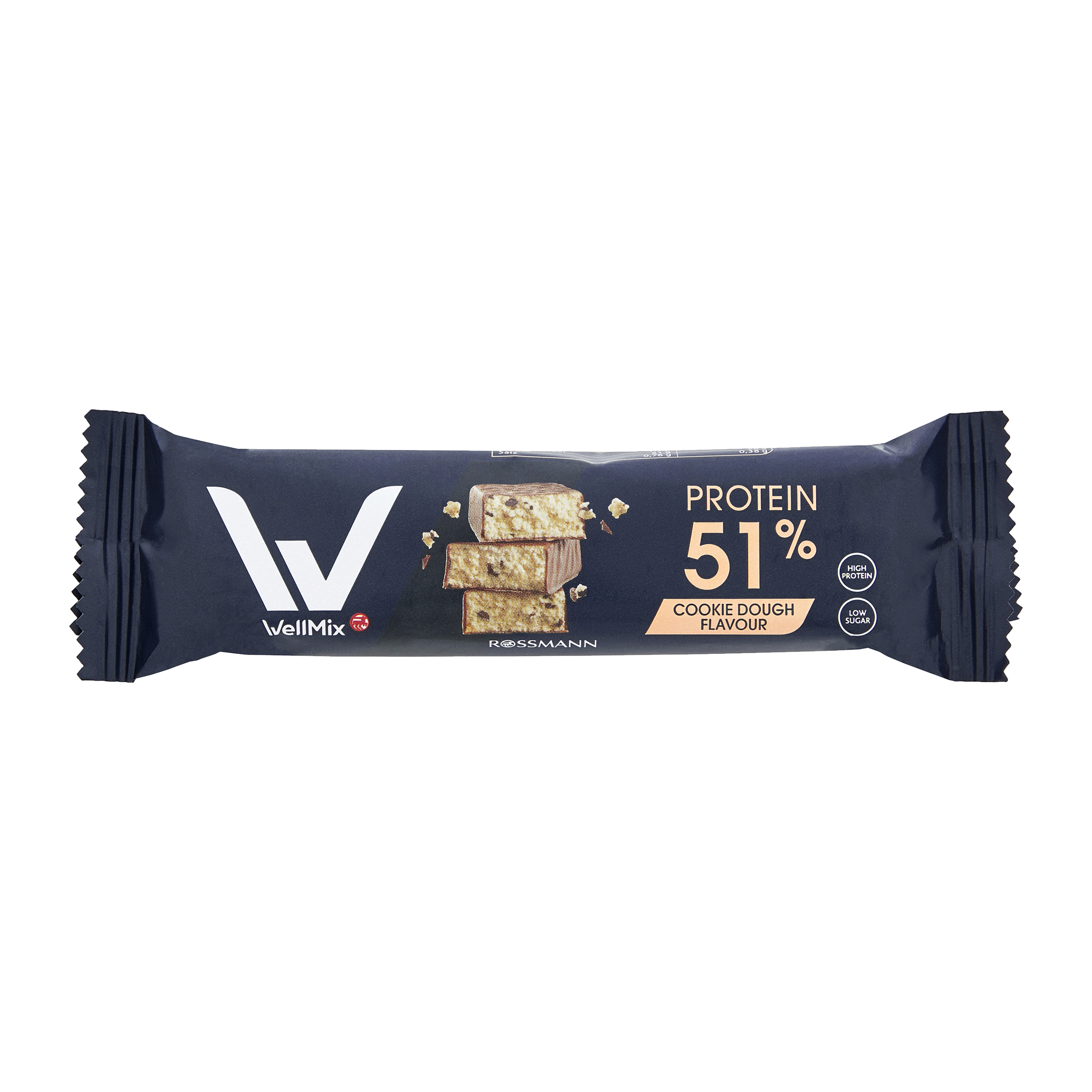 Proteinová tyčinka s příchutí 51 % sušenkového těsta. Tyčinka obsahuje 51 % bílkovin a pravé kakaové kousky.