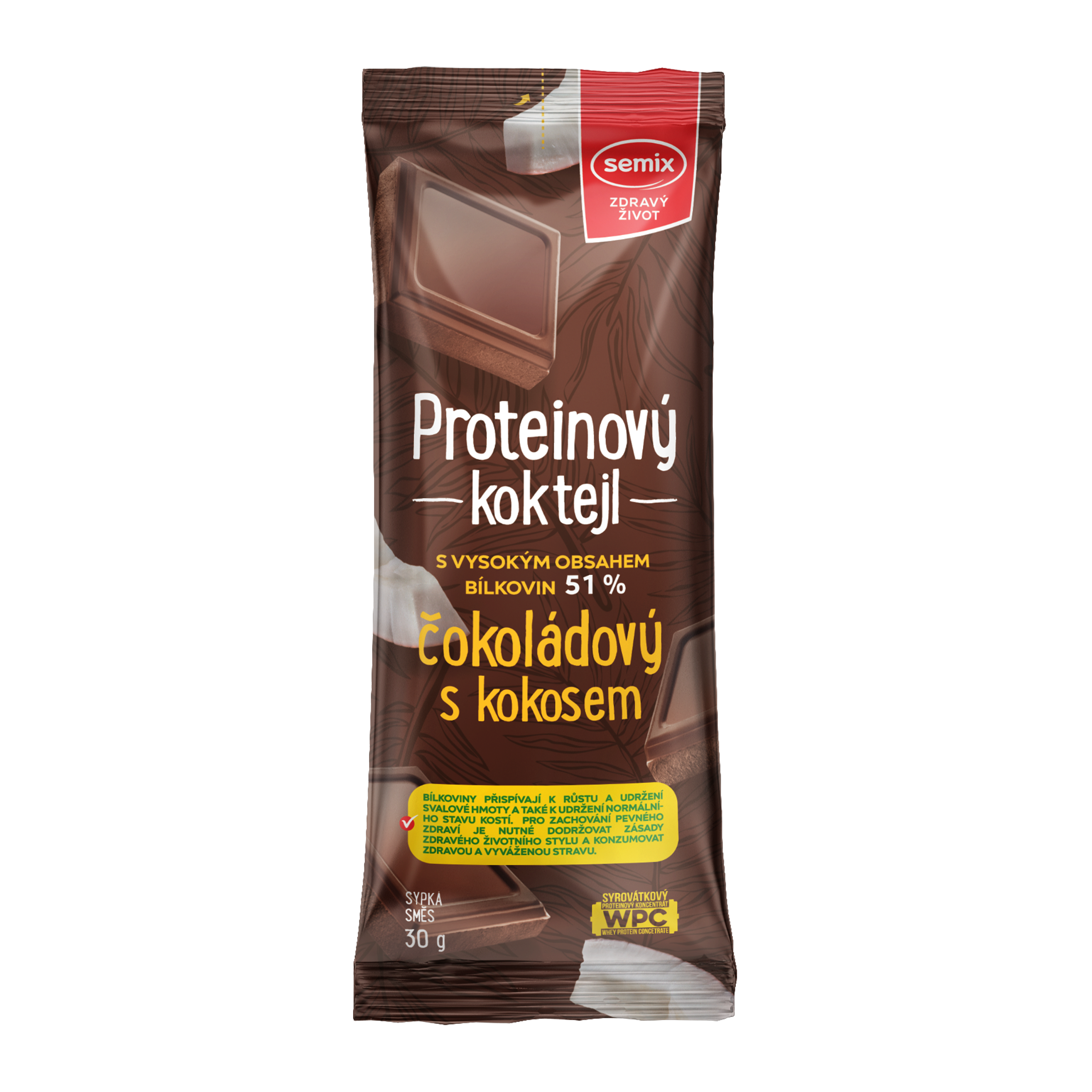 Proteinový koktejl je instantní nápoj s příchutí čokolády s kokosem.