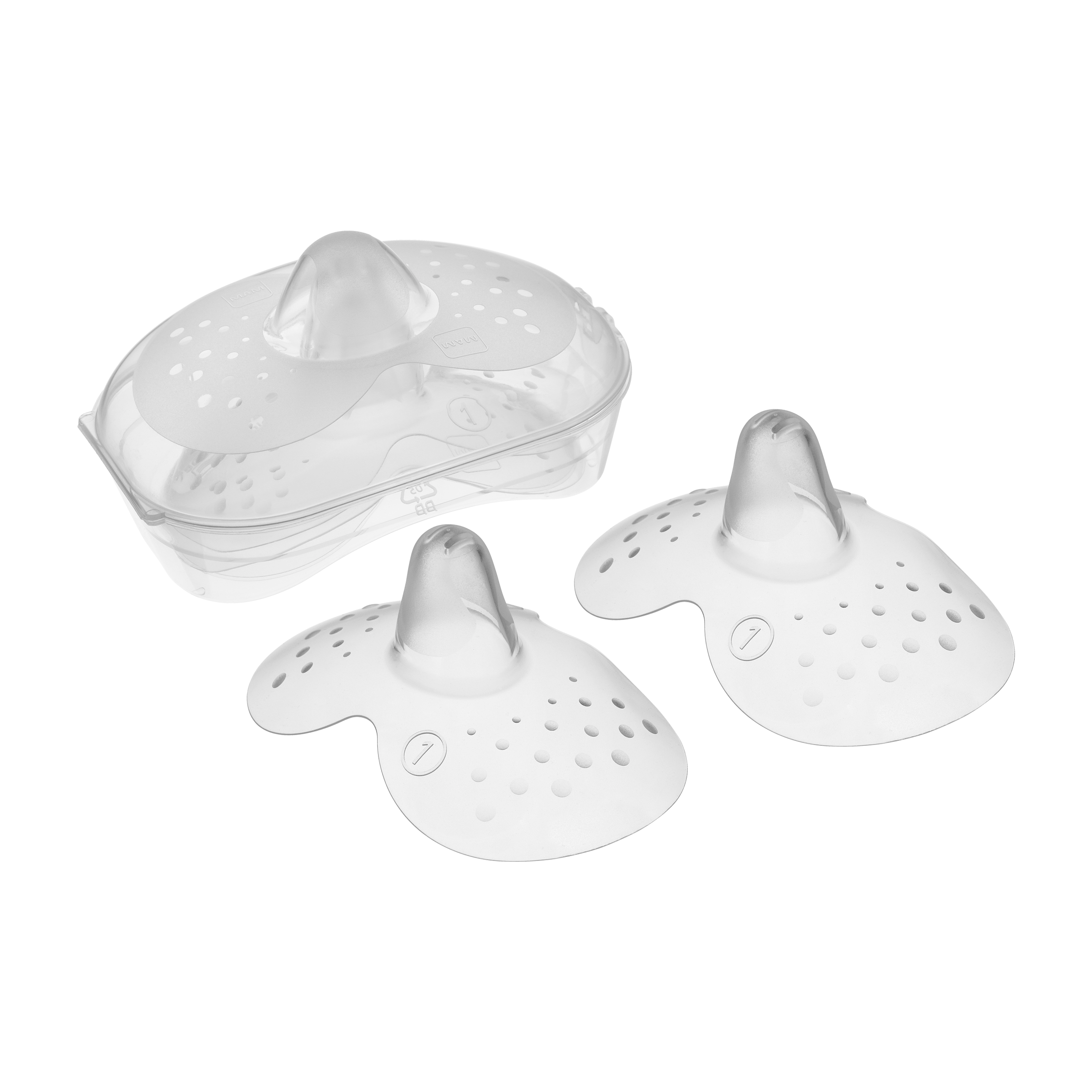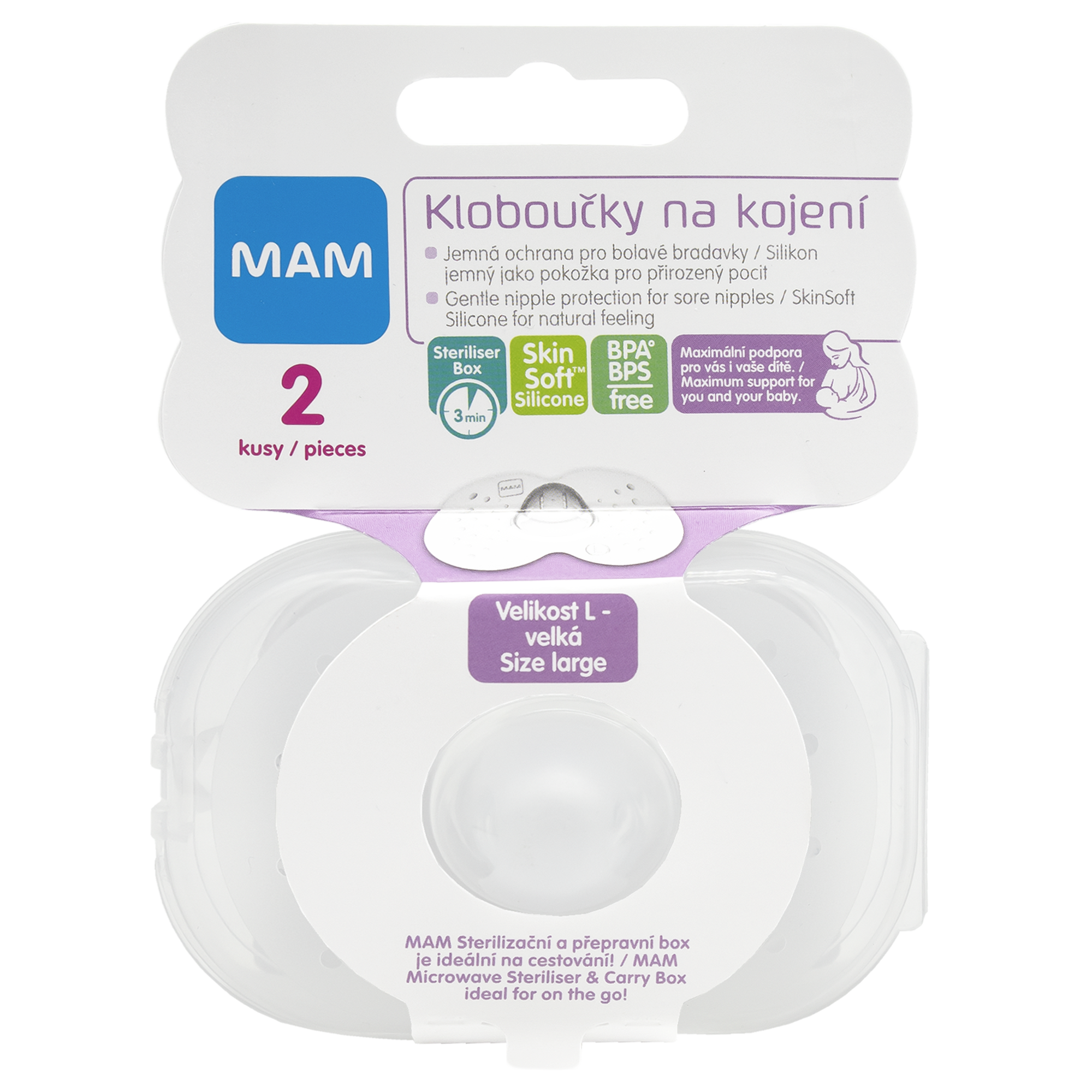 MAM prsní kloboučky poskytují krátkodobou pomoc při kojení. Jemná ochrana pro bolavé bradavky. Unikátní tvar umožňuje dítěti cítit matčinu pokožku. Silikon jemný jako pokožka pro přirozený pocit při kojení. Strukturovaný povrch umožňuje proudění vzduchu mezi miminkem a prsním kloboučkem – díky tomu je velmi jemný k dětské pokožce. Součástí balení je i praktický sterilizační box – sterilizováno během 3 minut v mikrovlnné troubě. Velikost L – velká (23 mm). Balení obsahuje 2 ks.