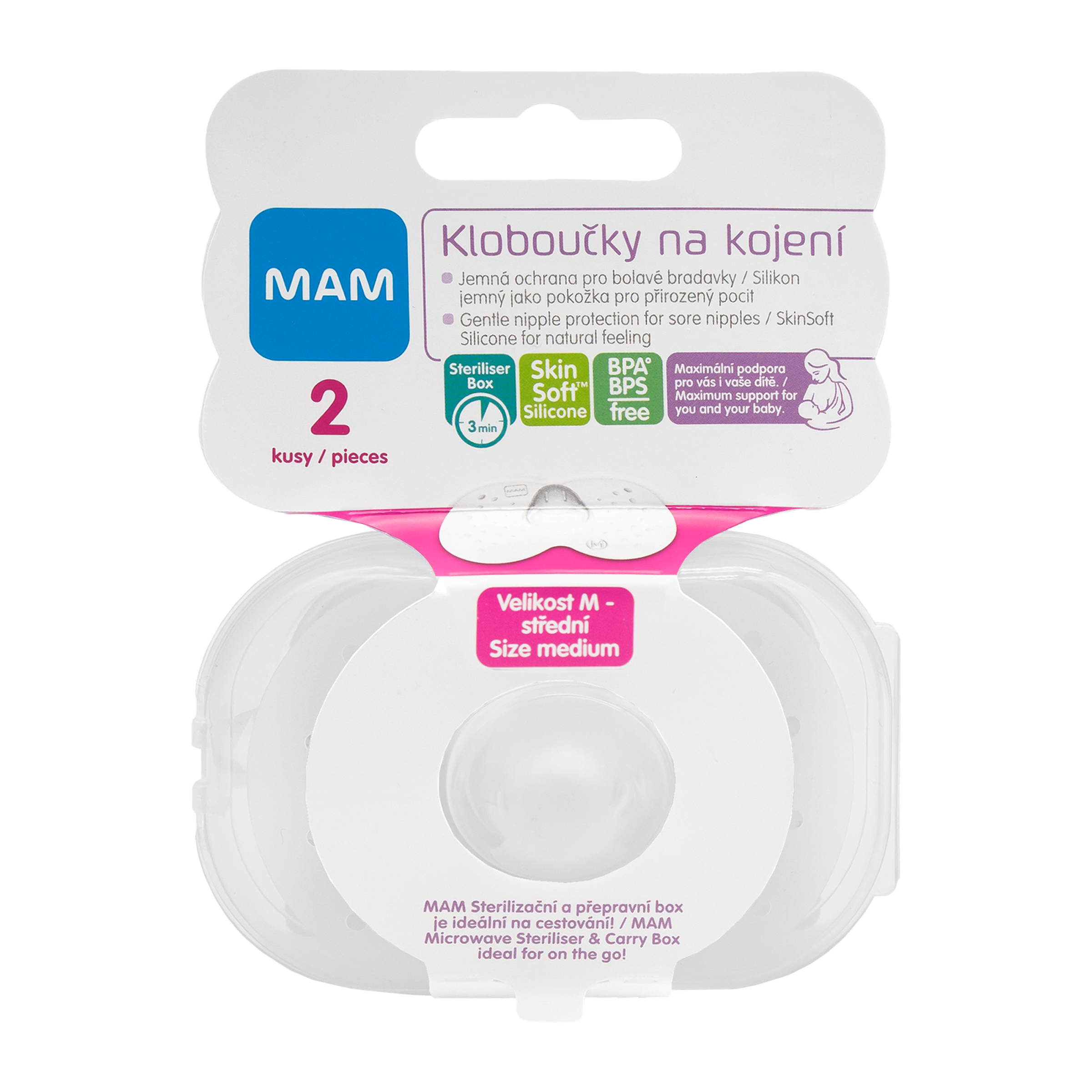 MAM prsní kloboučky poskytují krátkodobou pomoc při kojení. Jemná ochrana pro bolavé bradavky. Unikátní tvar umožňuje dítěti cítit matčinu pokožku. Silikon jemný jako pokožka pro přirozený pocit při kojení. Strukturovaný povrch umožňuje proudění vzduchu mezi miminkem a prsním kloboučkem – díky tomu je velmi jemný k dětské pokožce. Součástí balení je i praktický sterilizační box – sterilizováno během 3 minut v mikrovlnné troubě. Velikost M – střední (20 mm). Balení obsahuje 2ks.