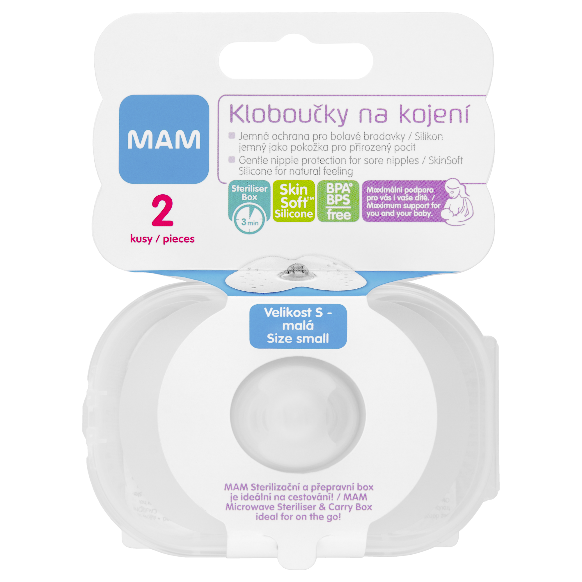 MAM prsní kloboučky poskytují krátkodobou pomoc při kojení. Jemná ochrana pro bolavé bradavky. Unikátní tvar umožňuje dítěti cítit matčinu pokožku. Silikon jemný jako pokožka pro přirozený pocit při kojení. Strukturovaný povrch umožňuje proudění vzduchu mezi miminkem a prsním kloboučkem – díky tomu je velmi jemný k dětské pokožce. Součástí balení je i praktický sterilizační box – sterilizováno během 3 minut v mikrovlnné troubě. Velikost S – malá (17 mm). Balení obsahuje 2 ks.