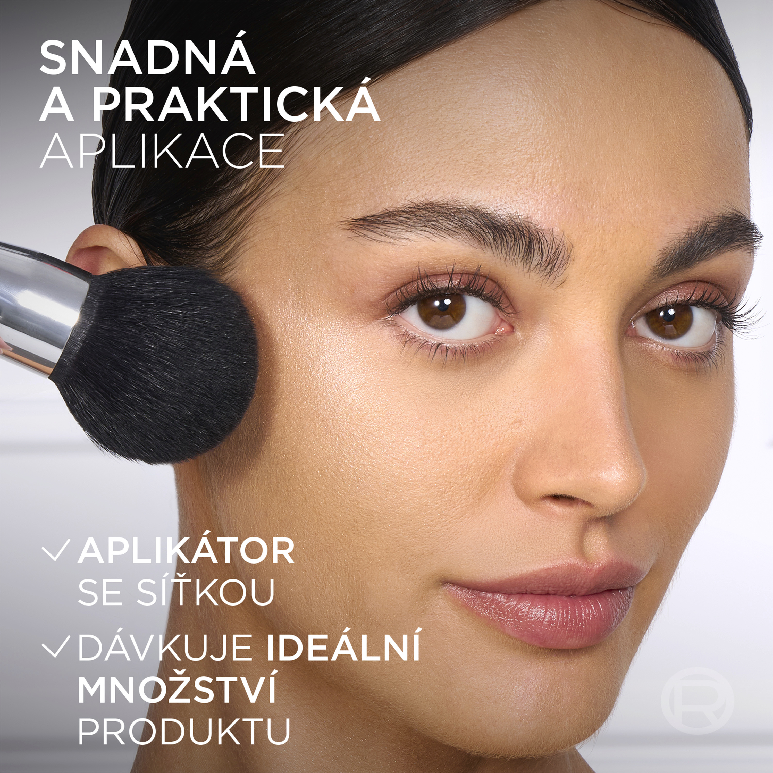 Naneste pudr na štětec nebo aplikátor. Naneste jemnými tahy nebo vtlačením do pleti, pro bezchybné zafixování make-upu.