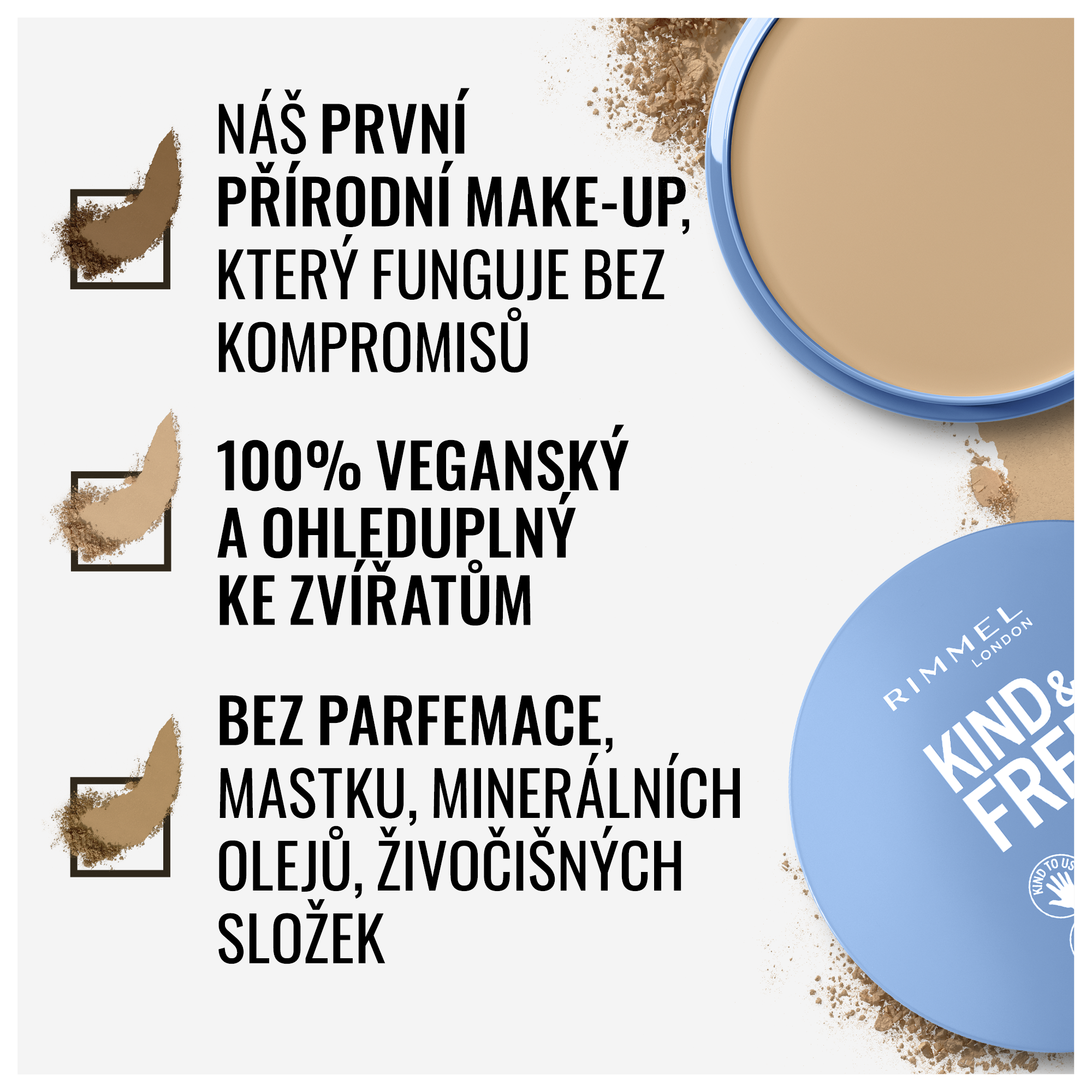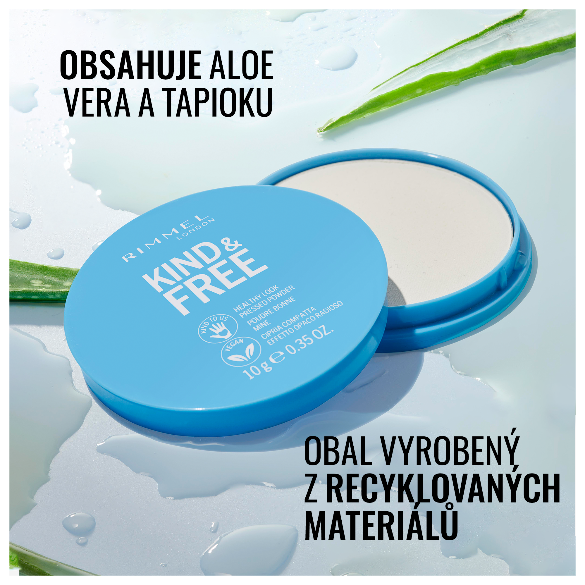 Rimmel London představuje svůj úplně první veganský kompaktní pudr bez kompromisů. Složení je bez minerálních olejů a jakýchkoliv složek živočišného původu. Jeho složení je lehké a dlouhotrvající, navíc pleť zmatňuje a zanechává ji přirozeně rozzářenou. Složení je obohaceno o aloe vera.
