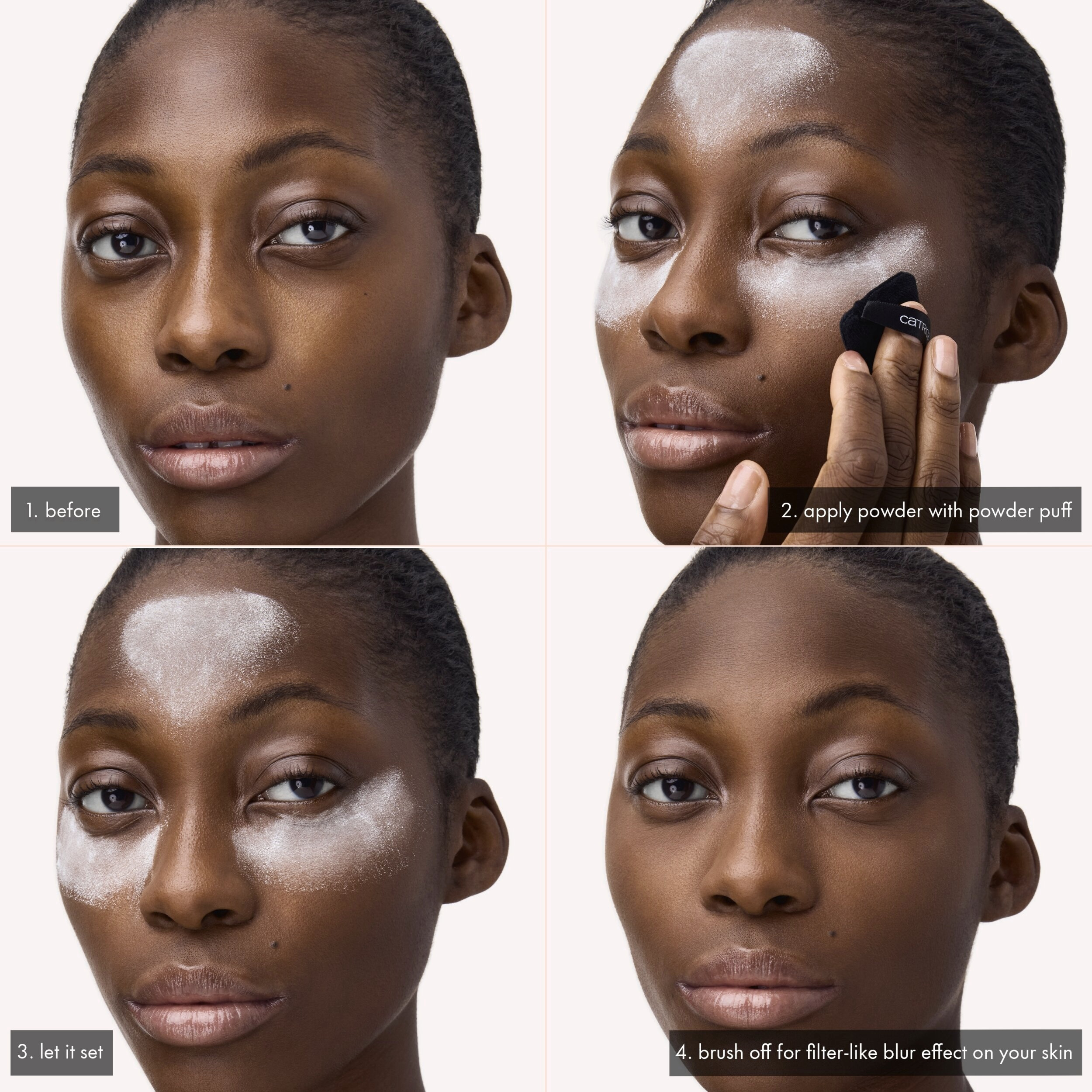 Pomocí štětce na pudr rovnoměrně naneste pudr na zadní stranu ruky oklepejte přebytečný produkt. Naneste jemně na obličej a vytvořte bezchybný make-up look.