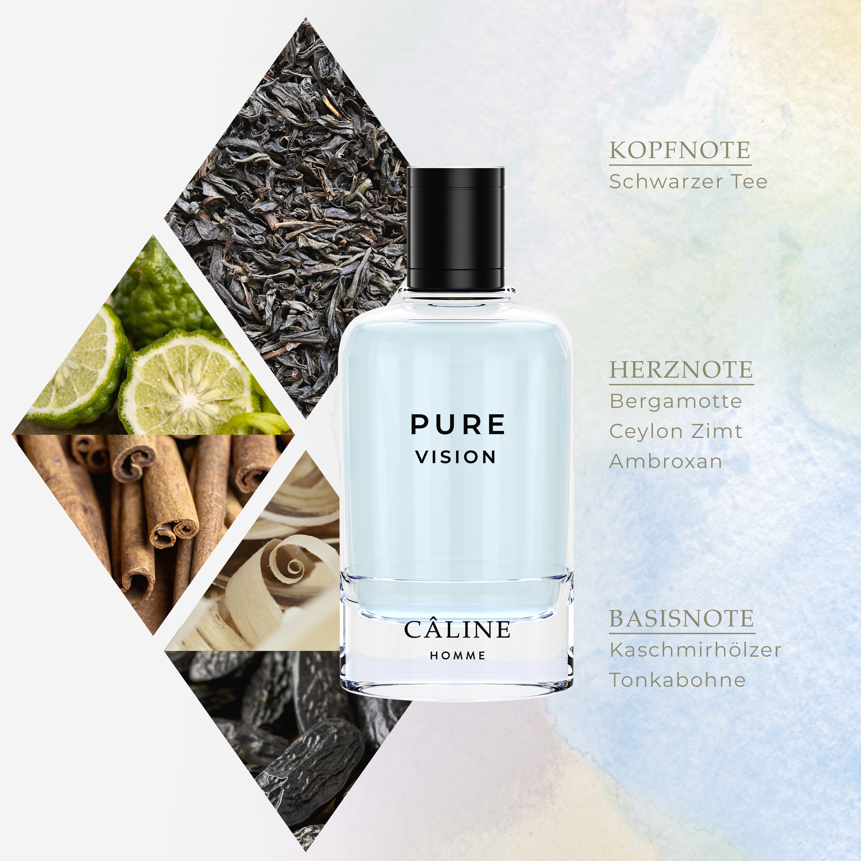Toaletní voda Pure Vision přináší vyváženou kompozici, která propojuje lehkost s hřejivým charakterem. Úvod s černým čajem působí jasně a osvěžujícím dojmem, zatímco bergamot dodává vůni jiskru a energii. V srdci se rozvíjí kořenitá elegance cejlonské skořice doplněná moderním ambroxanem, který vůni propůjčuje současný, mužný výraz. Závěr patří kašmírovému dřevu a tonka bobům, jež vytvářejí jemně hřejivou, hebkou stopu. Transparentní tyrkysový flakon podtrhuje čistotu a lehkost této sofistikované vůně.
