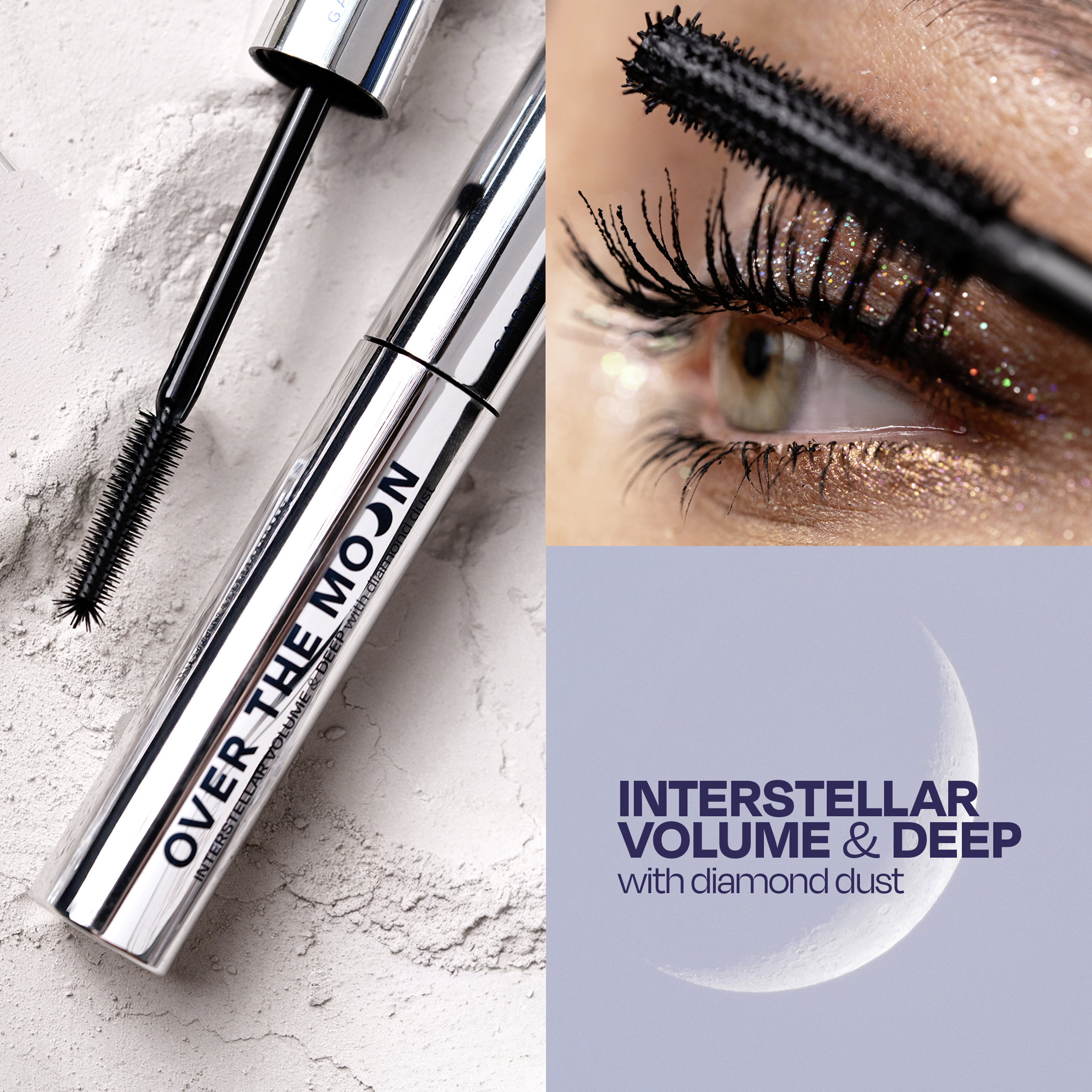 Řasenka Over the Moon Mascara Interstellar Volume & Deep s diamantovým prachem přináší mezihvězdný objem, prodloužení a dodá očím vesmírnou hloubku po celý den. Unikátní kónický kartáček se špičkou ve tvaru hvězdy dosáhne i na ty nejmenší řasy v koutcích a zajistí jejich oddělení a prodloužení. Díky inovativnímu designu štětinek rovnoměrně nanáší optimální množství produktu, takže stačí jediná vrstva pro intenzivní a elegantní pohled. Obsahuje speciální mix polysacharidů a pečující složky jako ricinový olej pro hloubkovou výživu řas a extrakt z měsíčku lékařského, který řasy chrání před vnějšími vlivy.