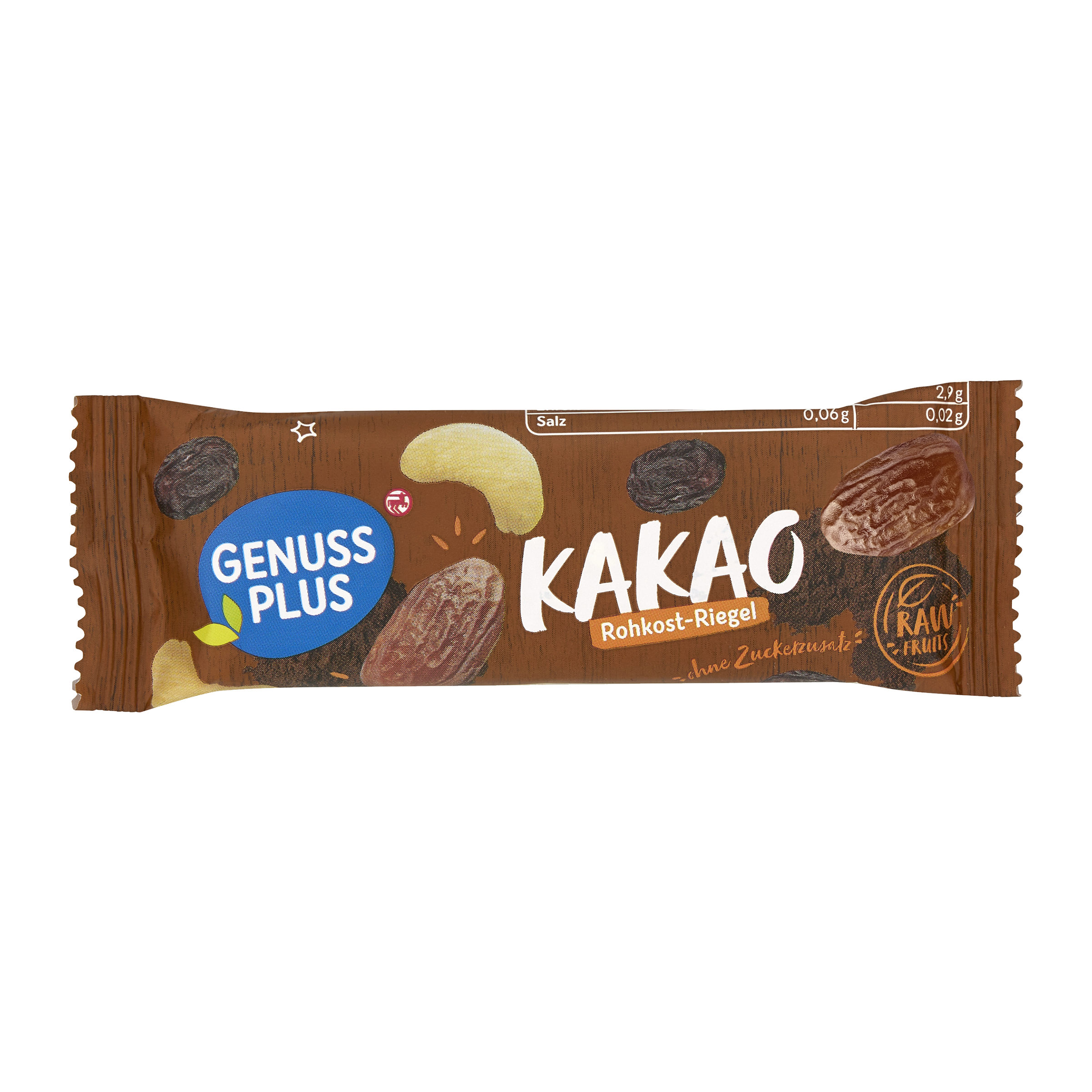 Ovocná tyčinka Genuss Plus s datlemi, kešu oříšky, sultánkami a kakaem.