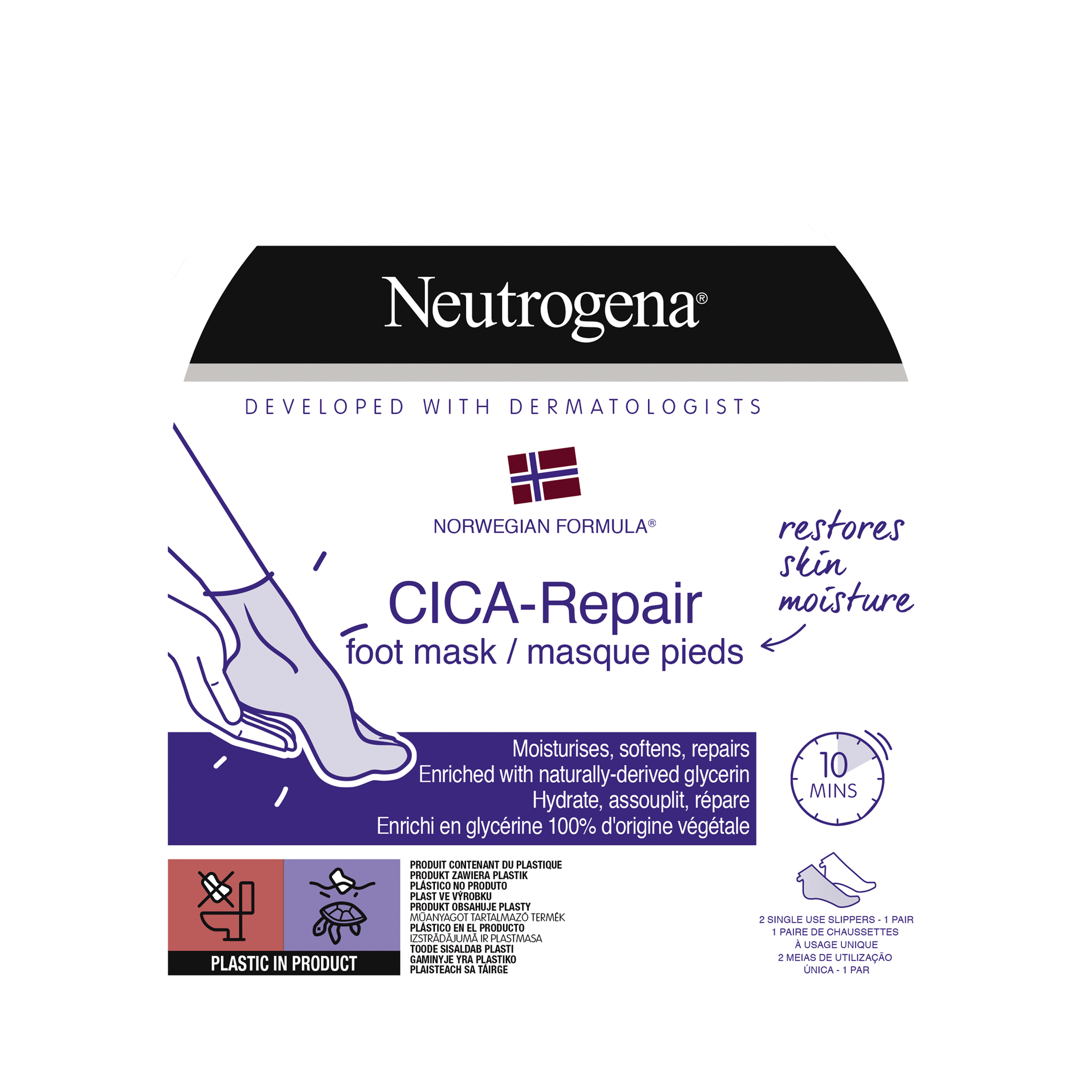 Neutrogena® Norská receptura Regenerační Cica maska na chodidla (1 maska = 0 60 % více hydratační látky*) Intenzivně vyživuje, pomáhá regenerovat pokožku a zanechává vaše chodidla výrazně hladší a jemnější. Doporučujeme zejména pro suchou pokožku a popraskané paty. Složení s vysokou snášenlivostí. Vhodné pro citlivou pokožku.
